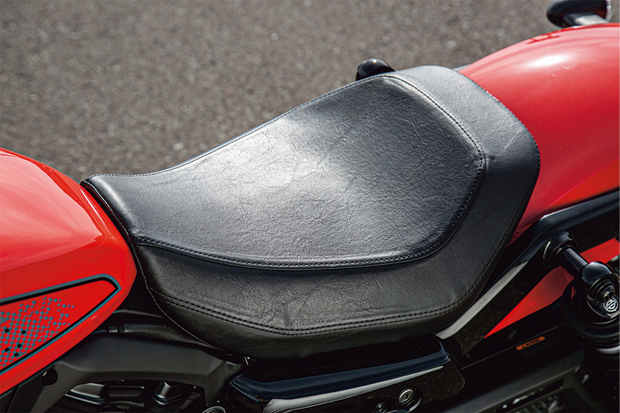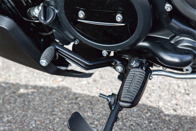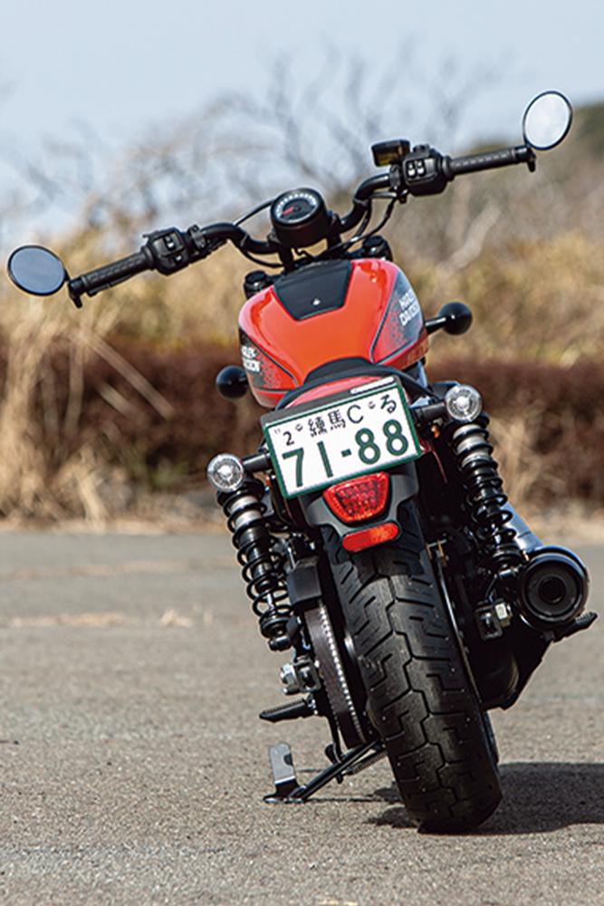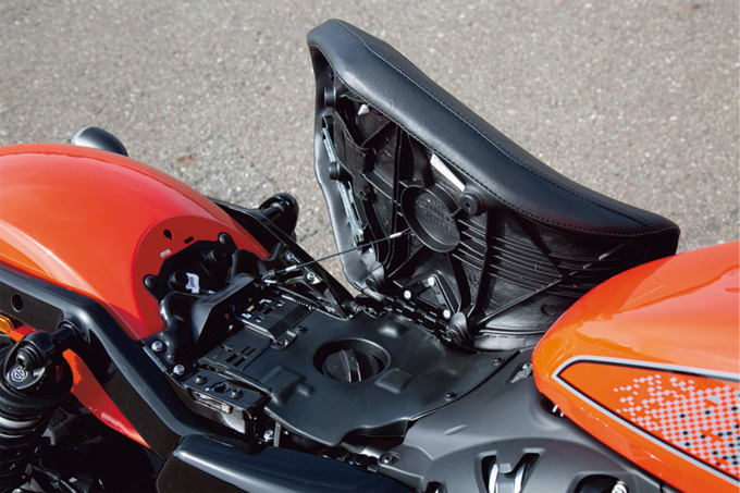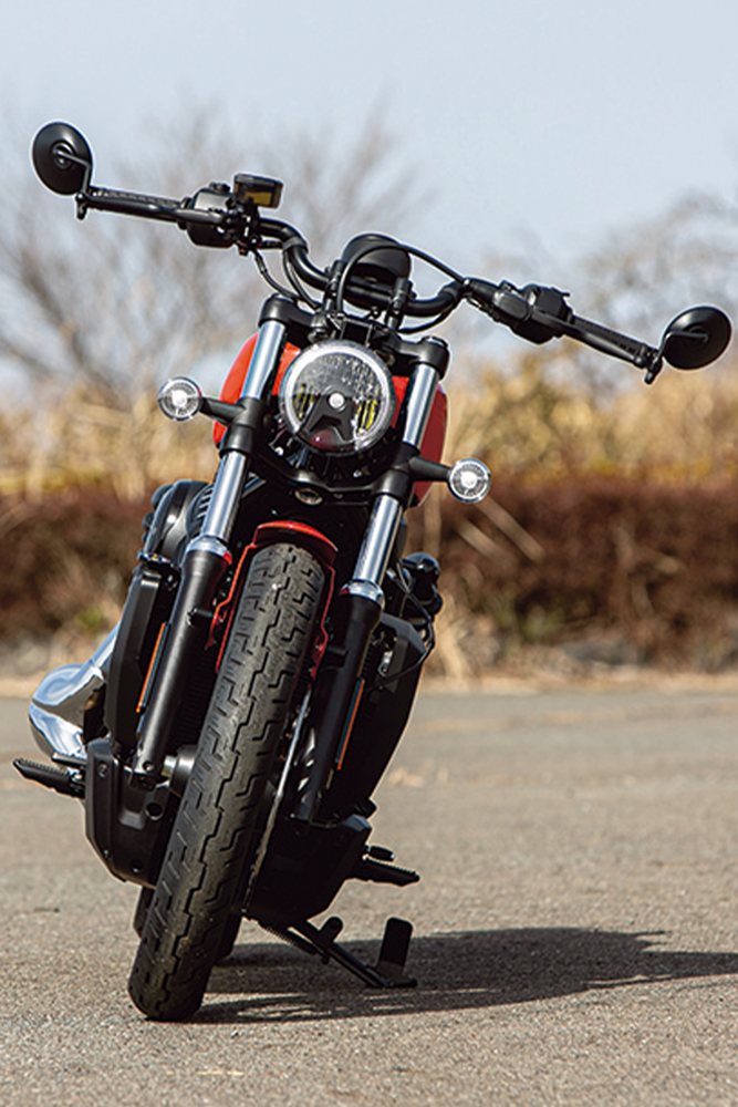 スピードをコントロールするブレーキはストリートからレースまで幅広いシーンで定評のあるブレンボ製キャリバーを前後に採用して信頼性を高めています。サスペンションもブレーキ同様フロントには定評のあるSHOWA製フォーク、リヤには十分なホイールトラベルを確保して、乗り心地を追求。そして、シート高が705㎜と低い設定なうえ、250㎏をゆうに超えるモデルが多いクルーザーモデルの中で、220㎏という車重を実現し、さらにはガソリンタンクをシート下に配するなど低重心にすることで、体格が小柄だったり非力なライダーにとって扱いやすい点もこのモデルの大きな魅力となっています。