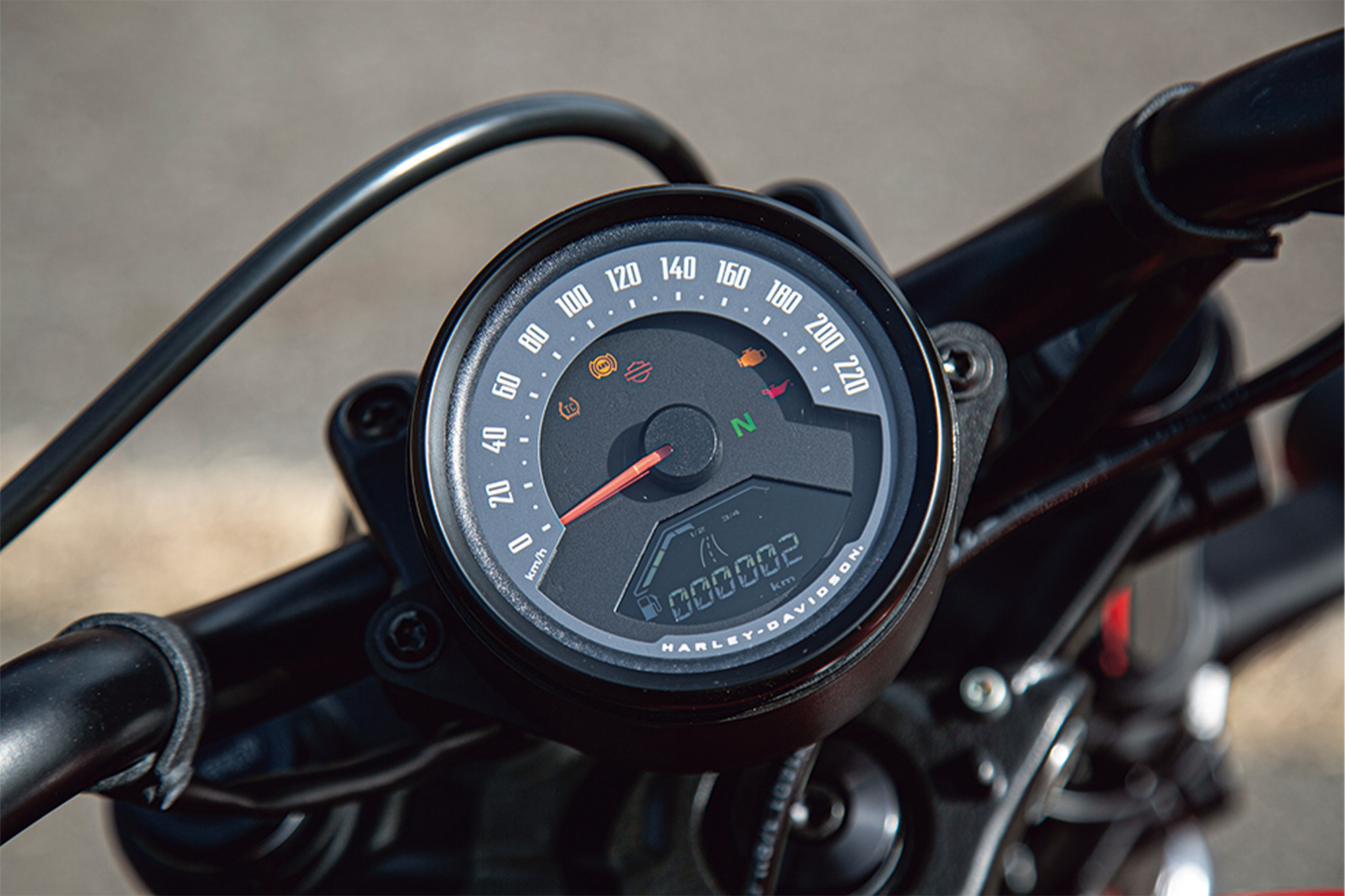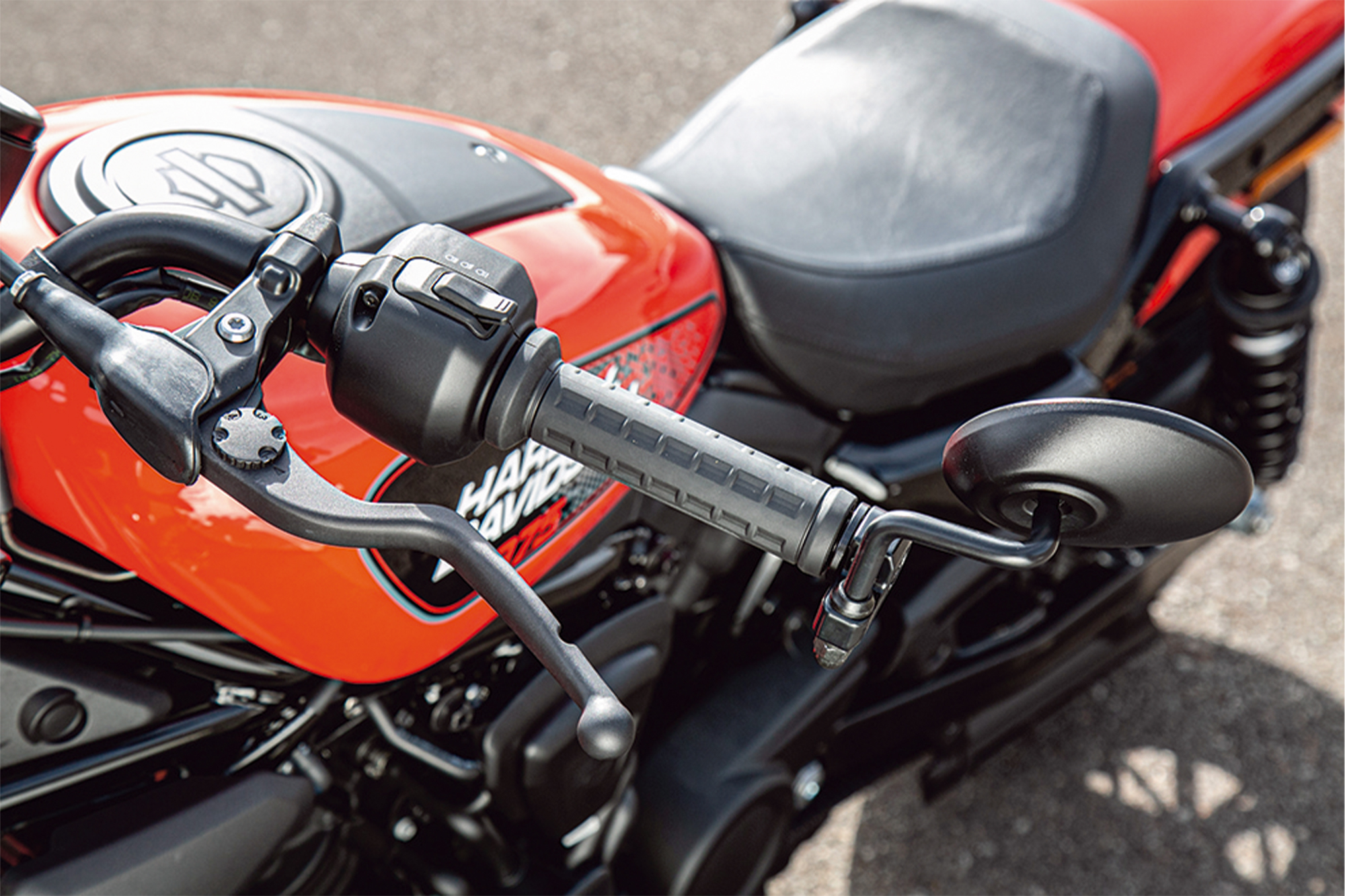 - 往年のXR750へのトリビュートデザインが象徴的なブラッドオレンジカラーは、 スポーツスターらしいルックスを強調。エンジン仕上げもブラックで都会的な新デザインです。