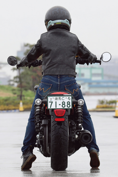 足を高く上げることなくまたがることができて、厚みのないブーツでも両足カカトまでベッタリ接地してヒザも軽く曲がるくらい足つきいいです。ライディングポジションは上体が軽い前傾になり、ハンドルグリップまでは遠くないし、違和感もありません