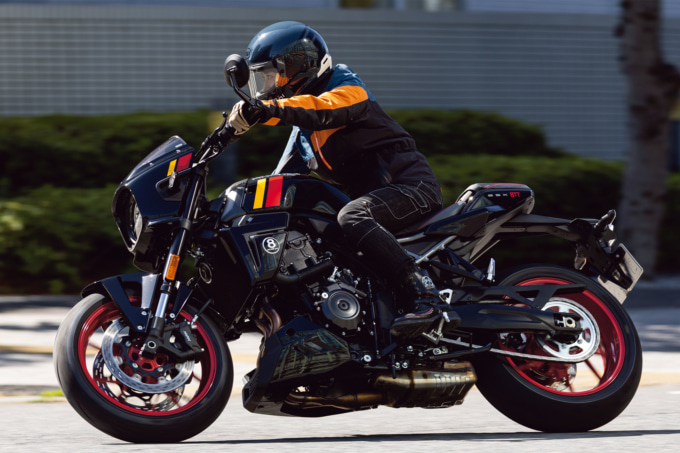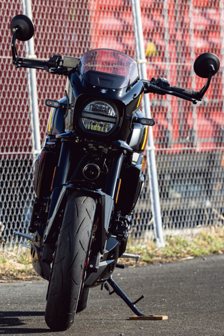 ここまで乗りやすさばかりに触れてきましたが、GSX-8Sをベースにしたモデルだけあってスポーティな走りもしっかり楽しめます。低中回転域のトルクが強いエンジンなので、アクセルを開けると想像以上に力強く加速してくれます。思ったとおりの速度まであっという間に到達し、パワーが伸びやかに立ち上がっていく感覚はとても爽快です。速度が乗っていても車体の安定感があり、コーナーを軽快に抜けていけるうえ、立ち上がりでも気持ちよくスピードに乗せることができるので、郊外のワインディングなどでスポーツバイクらしい楽しさをしっかり味わえます。見た目のクラシカルな雰囲気とは裏腹に、ベースモデルゆずりの軽快さを感じられる仕上がりです。