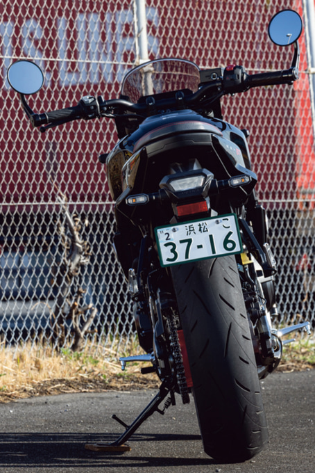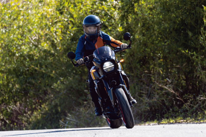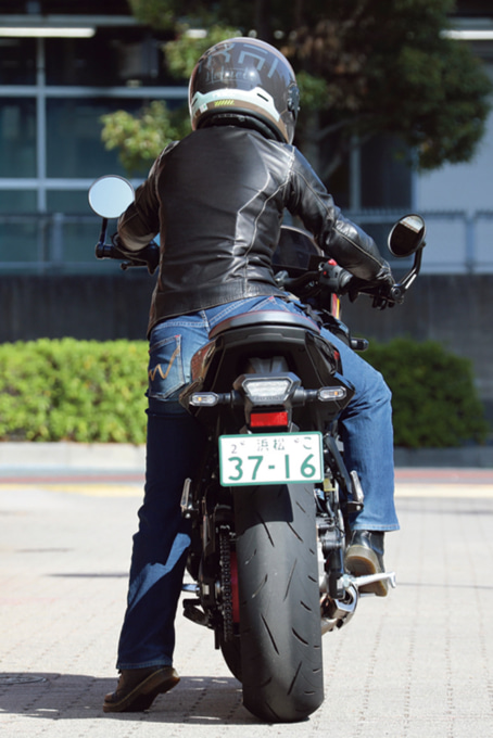 足つきは、身長163㎝の私で両足指の付け根が接地するくらい。中間排気量モデルらしく軽いとは言えませんが、走り出してしまえば安定感が高く、足つきの不安はそれほど気になりませんでした。また、ハンドル位置は一般的なネイキッドモデルより少し低めですが、スポーツモデルほど低いわけではありません。幅も広く絞りも強くないため、肩やヒジに余裕を持たせた自然なライディングポジションが取れます。上体も極端に前傾にならず、アイポイントを高く保てるので視界も広く感じ られました。そのため走行中も安心感があります。コーナーでは自然と体を車体に任せられるような感覚で、バイクがライダーをサポートしてくれているような印象でした。