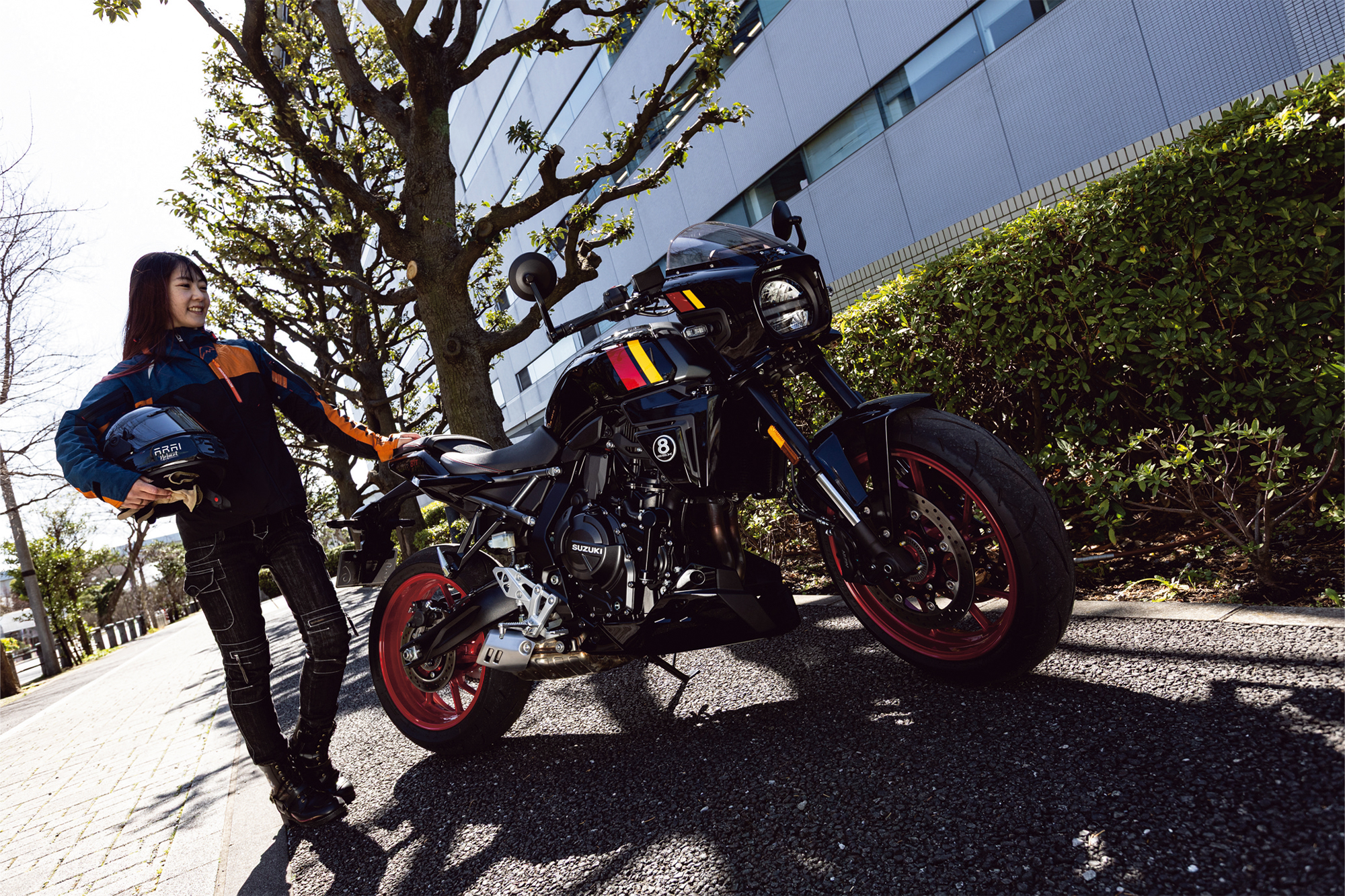 そして今回の試乗でとくに驚いたのがUターンのしやすさです。初めて乗るバイクでUターンをする時は少し緊張してしまうものですが、このGSX-8TTではその不安がほとんどありませんでした。安定感のあるトルクのおかげで、スルスルと意のままに車体をコントロールできるのです。実際に最初にUターンを試みた際、“このバイクなら全然大丈夫そう”と素直に思えました。個人的には、ここまで安心してUターンできるモデルはなかなか少ないので驚きました。今回の撮影では都内の街中を走りながら何度かコーナリングやUターンも試しましたが、そのたびに“この乗り心地は本当に 安心できるなぁ”と感じていました。見た目はレトロで力強い印象ですが、実際に乗ると想像以上に扱いやすく、とても紳士的なキャラクターを持ったバイクです。ブレーキ性能も安心感があり、軽くレバーをにぎるだけでスッと減速してくれるので、コントロールしやすい感覚でした。エンジンブレーキもしっかり効くため、速度調整もスムーズです。