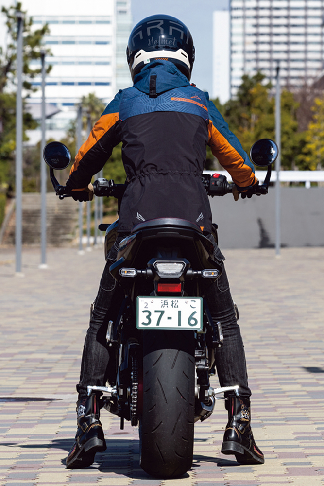 足つきは、身長163㎝の私で両足指の付け根が接地するくらい。中間排気量モデルらしく軽いとは言えませんが、走り出してしまえば安定感が高く、足つきの不安はそれほど気になりませんでした。また、ハンドル位置は一般的なネイキッドモデルより少し低めですが、スポーツモデルほど低いわけではありません。幅も広く絞りも強くないため、肩やヒジに余裕を持たせた自然なライディングポジションが取れます。上体も極端に前傾にならず、アイポイントを高く保てるので視界も広く感じ られました。そのため走行中も安心感があります。コーナーでは自然と体を車体に任せられるような感覚で、バイクがライダーをサポートしてくれているような印象でした。