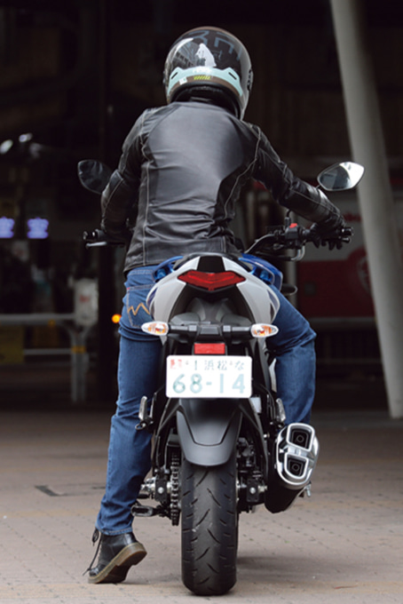 余裕のある足つきではありませんが、車体がスリムかつコンパクトなので体が小さくても抵抗なくまたがれ、片足でも十分支えられます。また、アップライトなライディングポジションとなり、腕や腰への負担が少ない印象です