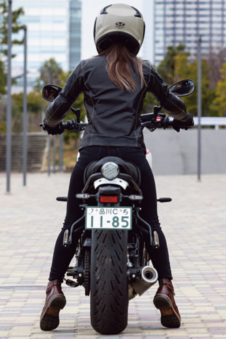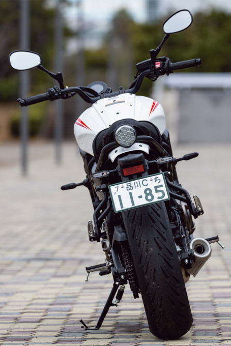 全長が2100㎜を切るコンパクトな車体は、シートからハンドルまでの距離も遠くはなく、小柄な女性にもとっつきやすいモデルと言える でしょう。その車体を作り出しているフレームは高張力鋼管を用いた軽量なバックボーンタイプで、場所によって張力強度の違う鋼管を組み合わせることで、剛性としなやかさのバランスを追求しています。また、シートフレームを溶接するのではなくボルトオンにしており、カスタムも考慮していることがわかります。フレームとともに車体の安定に寄与するサスペンションは、φ41㎜のインナーチューブを採用した正立フロントフォークと、ボディ側締結箇所をエンジンのクランクケースとすることで、サスペンション反力のフレームへの負担を軽減するモノショックリヤサスペンションの組み合わせとなっています。