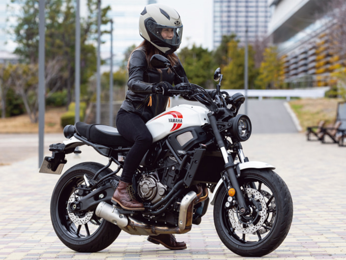 両足を下ろすとツマ先がつく程度の足つき。片足をステップに乗せればもう一方の足は母指球までしっかり届き、安定して車体を支えられます。700㏄クラスとしては軽く感じられて、女性の私でも安心して乗れる印象でした