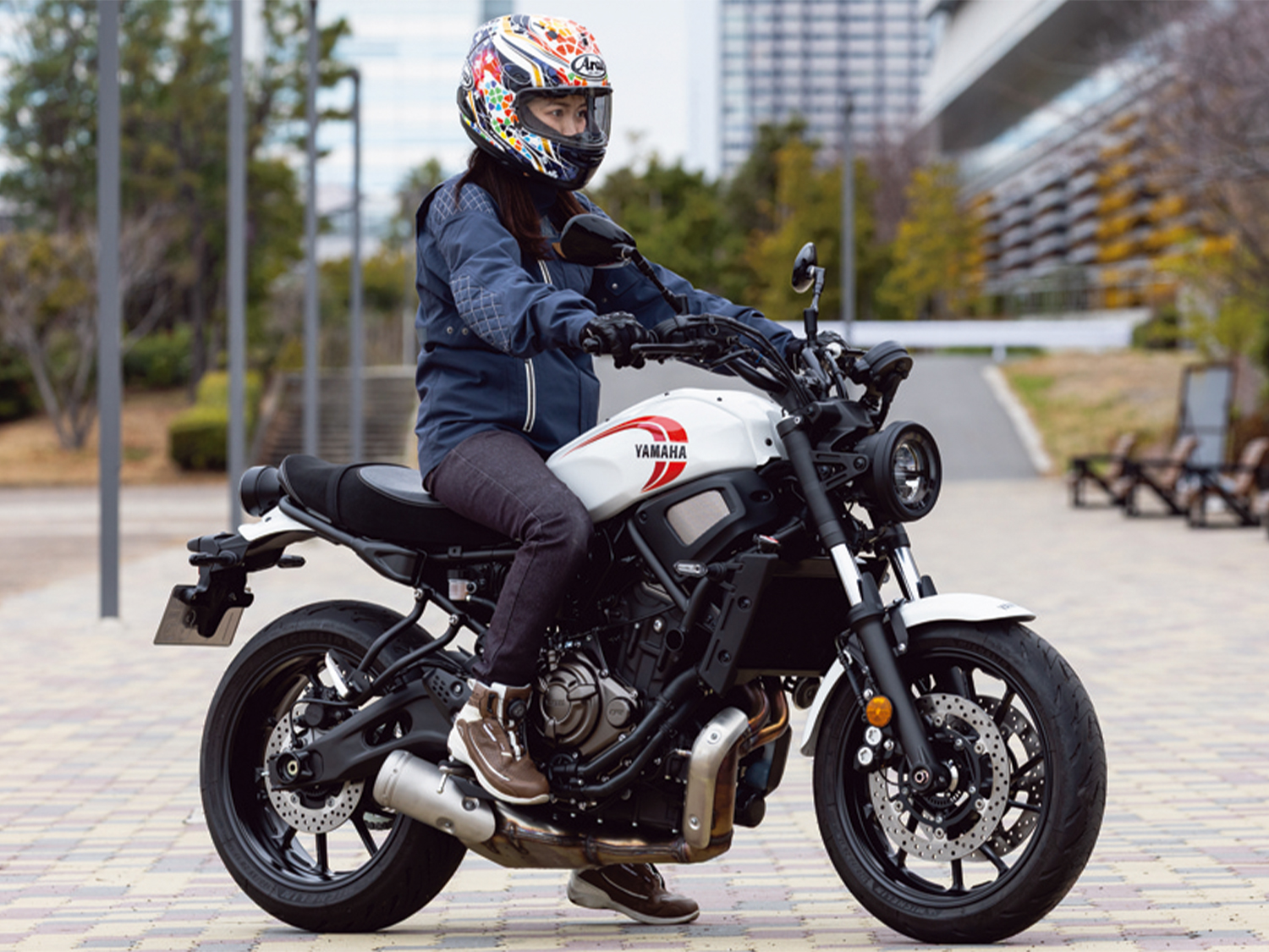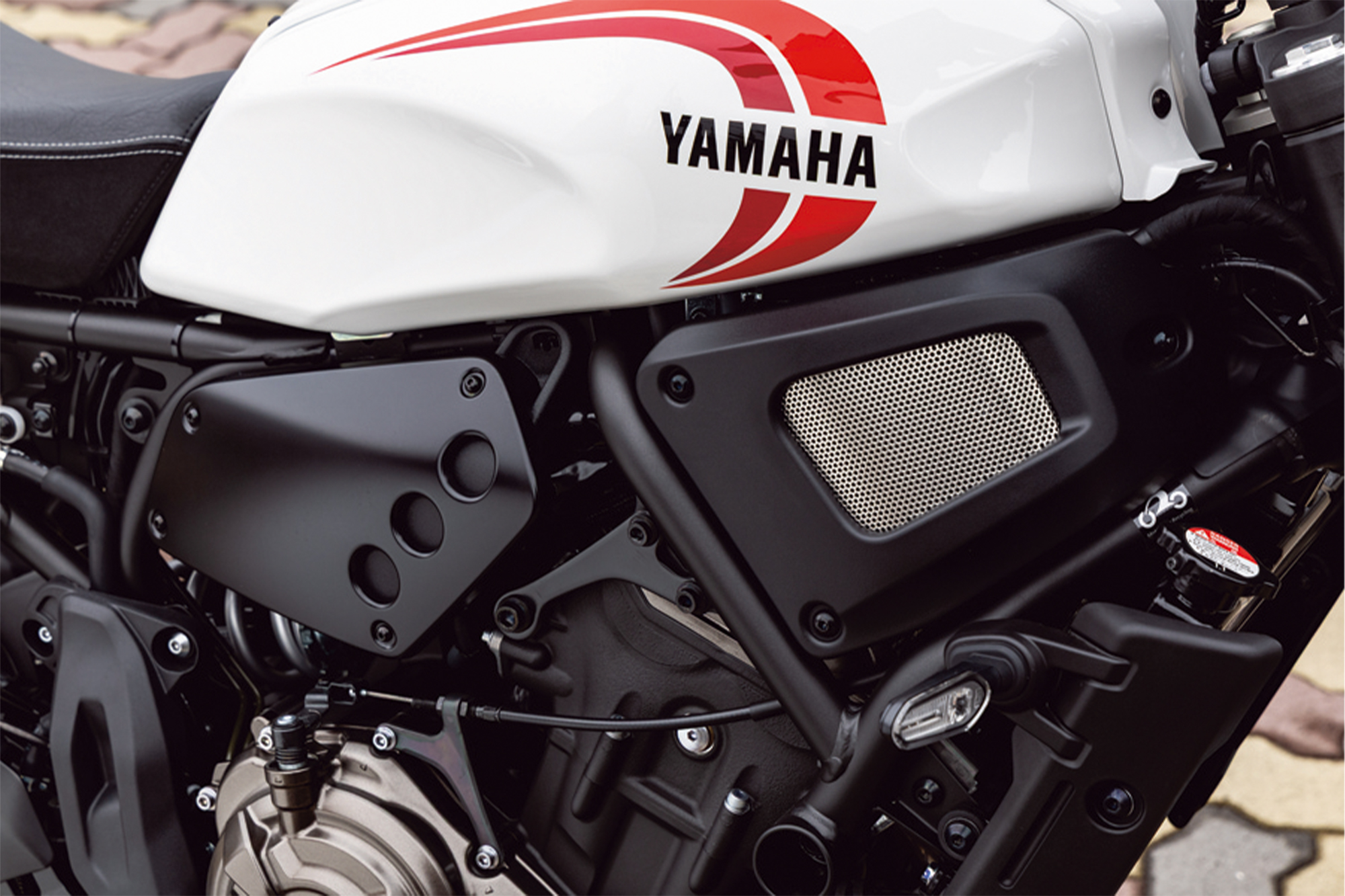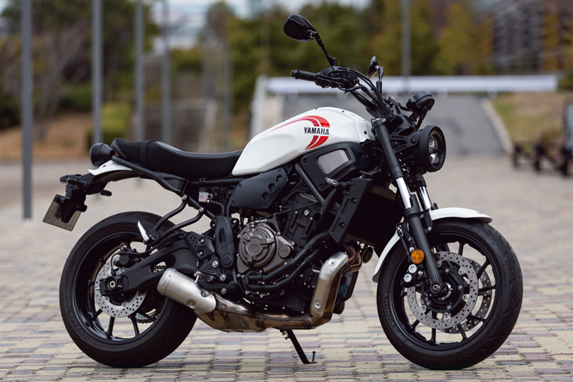そんなレトロを感じさせる見た目とはうらはらに、機能面は最新のパフォーマンスが与えられています。バイクの心臓とも言えるエンジンは、ライダーのスロットル操作に対し、リニアなトルクを創出することを追い求めた“クロスプレーンコンセプト”に基づいた270度位相クランクの688㎤水冷4ストロークDOHC4バルブ並列2気筒を採用。270度位相クランクは、乗り手が鼓動感を楽しめるのが一つの特徴となっています。スポーツネイキッドMT-07に採用されているモノをベースとしていて、そのことからもどんなパフォーマンスかはうかがい知ることができるでしょう。エンジンとともに速度をコントロールするブレーキは、対向4ポットキャリパーをダブルで採用するフロントとリヤシングルのディスクブレーキという十分な組み合わせです。