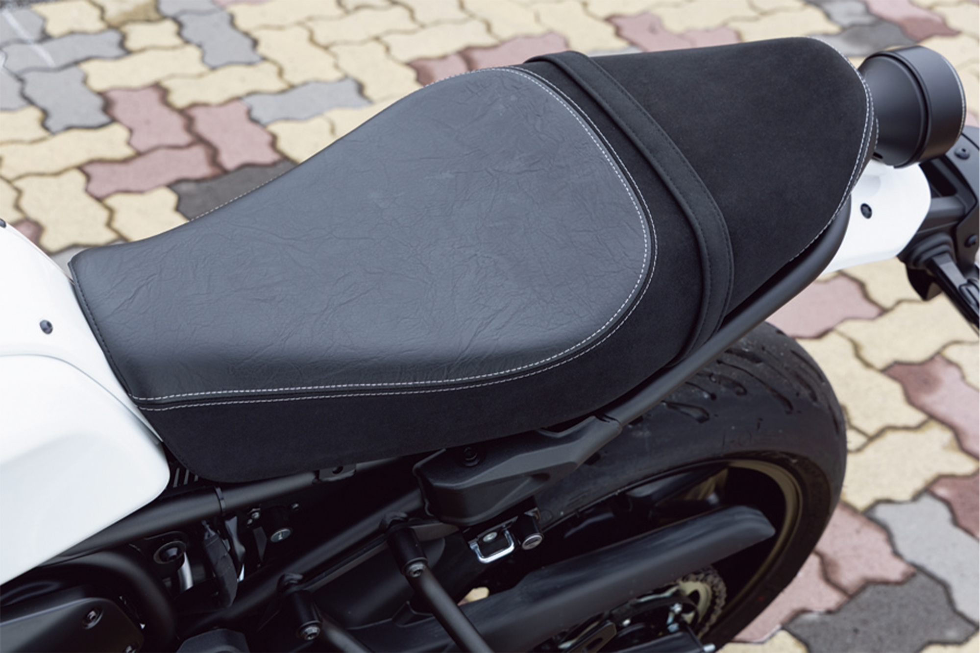 全長が2100㎜を切るコンパクトな車体は、シートからハンドルまでの距離も遠くはなく、小柄な女性にもとっつきやすいモデルと言える でしょう。その車体を作り出しているフレームは高張力鋼管を用いた軽量なバックボーンタイプで、場所によって張力強度の違う鋼管を組み合わせることで、剛性としなやかさのバランスを追求しています。また、シートフレームを溶接するのではなくボルトオンにしており、カスタムも考慮していることがわかります。フレームとともに車体の安定に寄与するサスペンションは、φ41㎜のインナーチューブを採用した正立フロントフォークと、ボディ側締結箇所をエンジンのクランクケースとすることで、サスペンション反力のフレームへの負担を軽減するモノショックリヤサスペンションの組み合わせとなっています。