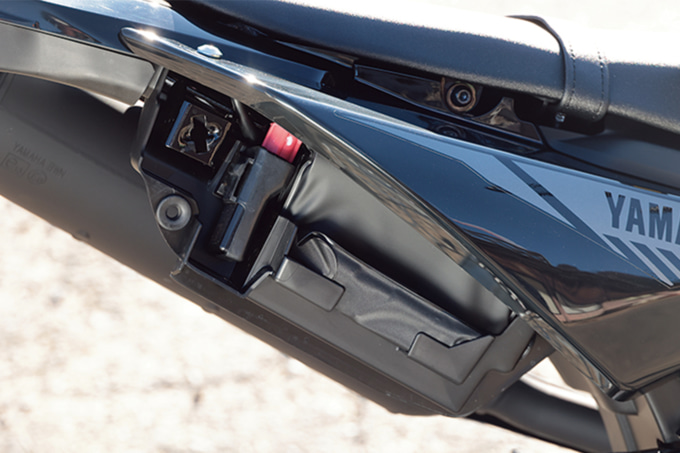 ここからはWR125Rならではの特徴に目を向けていきましょう。まずは最高出力11kW(15㎰)を生み出す水冷124㎤エンジン。エンジンの回転数によって稼働するバルブの数が変わるVVA(VariableValve Actuation:可変バルブ)を用いることで、低中速域のトルク感と高回転域の伸び感をバランスよく最大限に発揮できるようにしています。また、オフロード走行に求められる低中速トルクを確保するために大容量のエアクリーナーボックスも採用されています。そのボックスに装着されるエアクリーナーは、サイドカバーを外すだけで着脱ができるようになっていて、その点からもオフロード走行をしっかりと意識しているモデルだということがわかります。