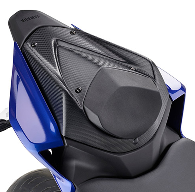 ボルト1本で着脱叶なシングルシートカウル。カーボンルックのデザインで、どのカラーでもマッチングは良好だ。ソフトサイドバッグとの同時装着はできず、取り付けは乗車定員変更に該当するため構造変更申請が必要になる。MT-25&03にも適合