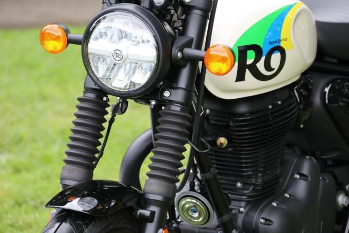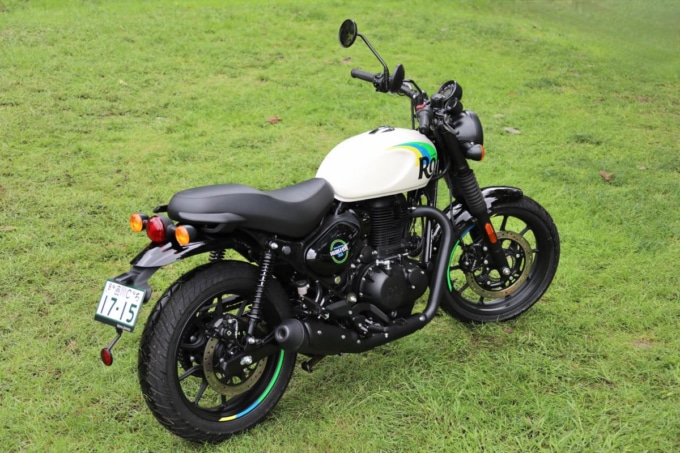 ハンター350は、そんなロイヤルエンフィールドがメテオ350やクラシック350に続いて2023年春にラインナップへ加えた350クラスのモデルで、前2モデルと共通のプラットフォームを採用しつつ、前後に17インチホイールを履いたロードスタータイプとなる。2025モデルではアシスト&スリッパークラッチ、LEDヘッドライト、SHOWA製新型リヤショックを新たに採用して機能面を充実。ターンバイターンタイプのナビゲーション“トリッパー”とUSBタイプC充電ポートを装備して使い勝手もアップしている。