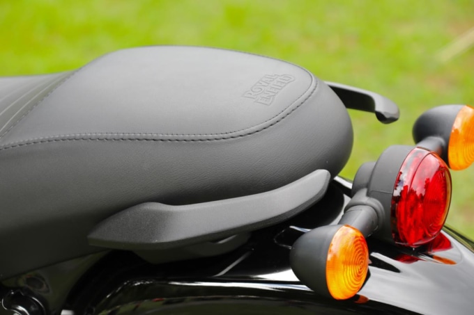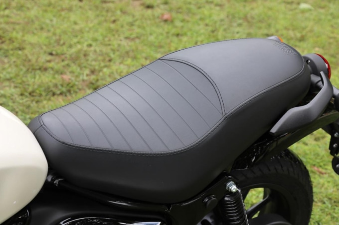 一体型のシートはライダーシート部が前後に長いためポジションの自由度が高い。また、タンデムシート部が比較的フラットなうえ幅もあるので大きなシートバッグを安定させやすい