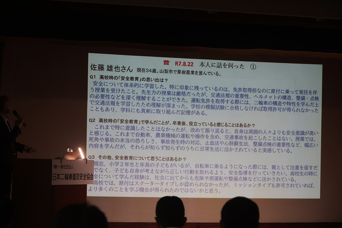 山梨県立北杜高等学校の坂本教頭のテーマは『高等学校における二輪車安全運転教育指導』。山梨県では高校でのバイク通学が広く認められている。北杜高校の坂本教頭は、長年交通安全教育に携わり、生徒が事故に遭わないよう日々指導している。