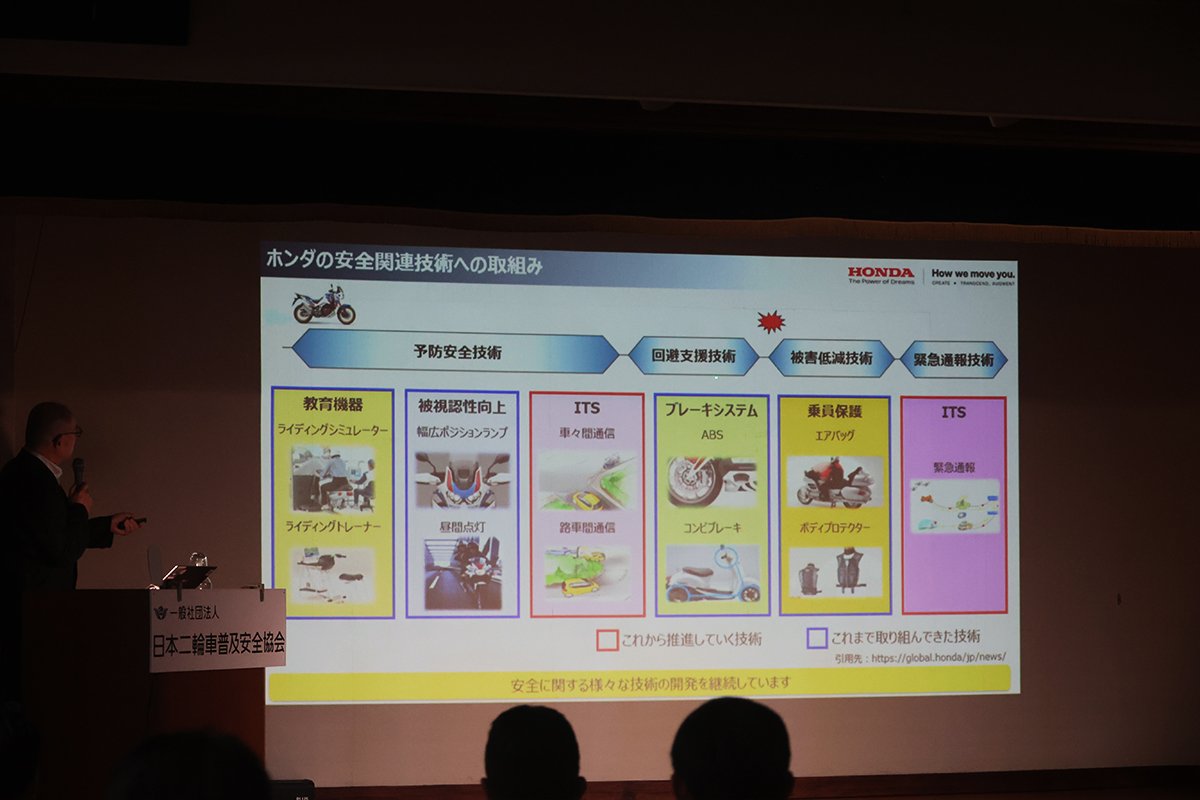 本田技研工業のエンジニア・谷一彦さんは『ホンダ二輪車の安全技術〜先進ブレーキ編〜』と題して講演を実施。谷さんは世界初のバイク用ABS(急ブレーキ時にタイヤがロックしにくくなる装置)や、前後のブレーキを自動で配分するシステムを開発してきた第一人者である。ホンダは「2050年に交通事故の死者ゼロ」を目標に掲げており、その一歩としてABSなどの安全装備を普及。今では世界の約85%のバイクに導入されている。
