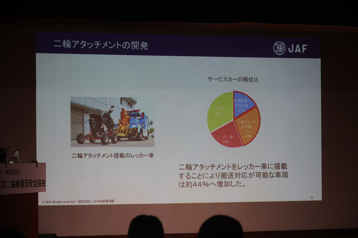 JAF(日本自動車連盟)の菅原さんは「バイクのロードサービスと専用装置の開発」について紹介した。JAFは24時間365日対応のロードサービスを行なっており、出動件数は年間約230万件。2005年からはバイクにも対応している。一般道ではバッテリー上がり、高速道路ではガス欠が多く、注意すれば防げるトラブルも多いという。