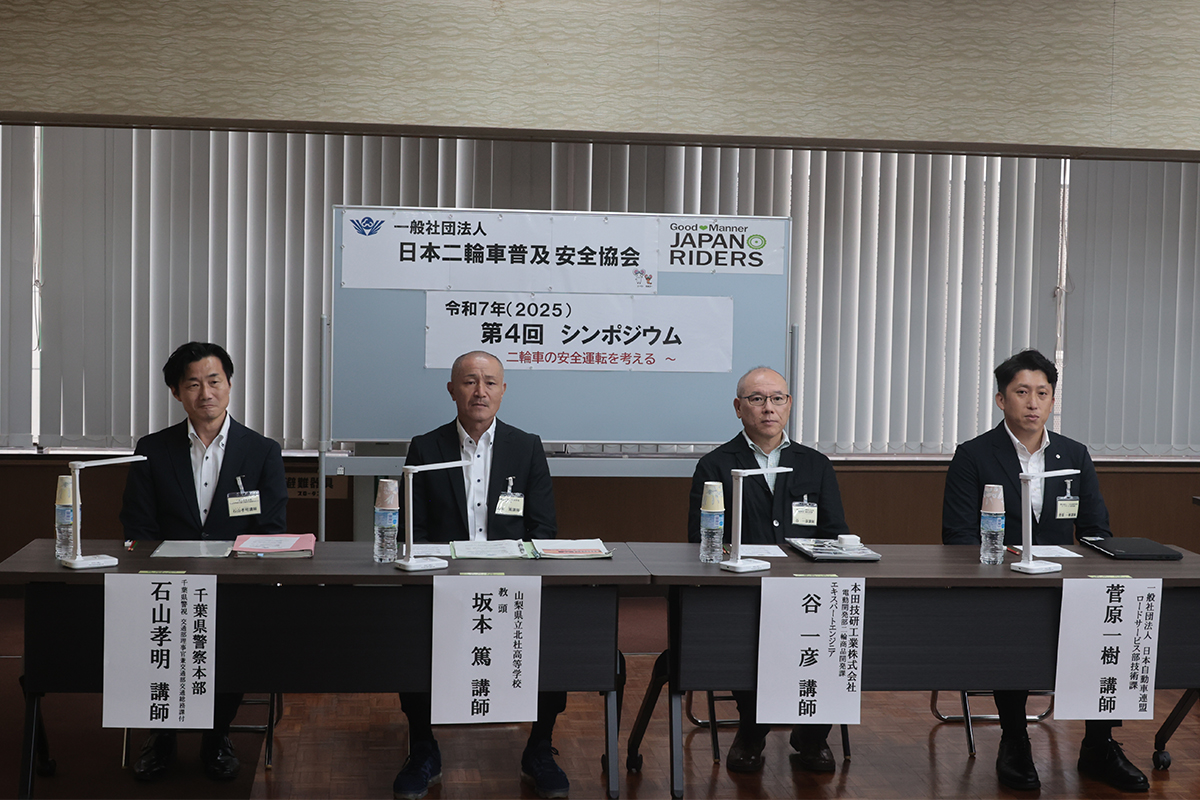 このシンポジウムは、健全な二輪車文化の醸成を目指し『二輪車の安全運転を考える』をテーマとしてきた。その第4回目は、千葉県警察・高校教頭・ホンダのエンジニア・JAFロードサービスのスタッフの4名が講師として招かれ、各々の立場からの安全と今後の課題について講義とパネルディスカッションを実施。
