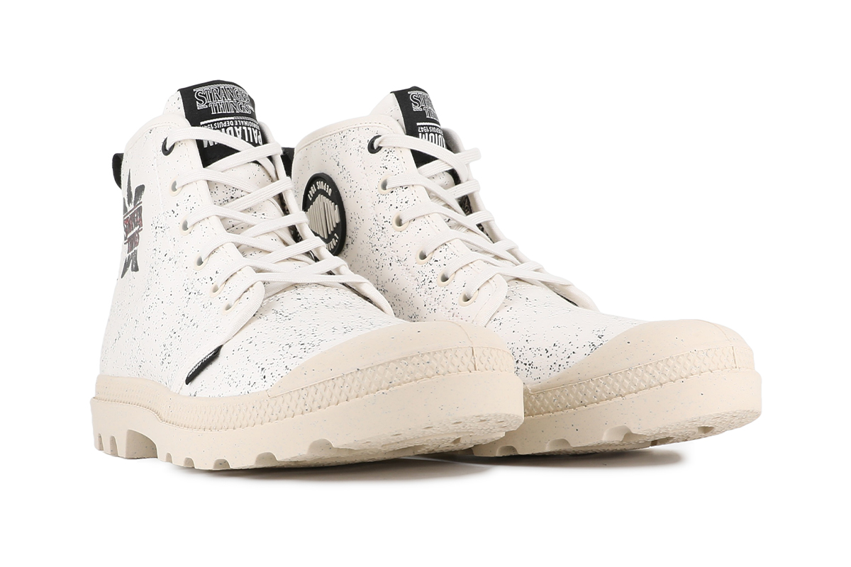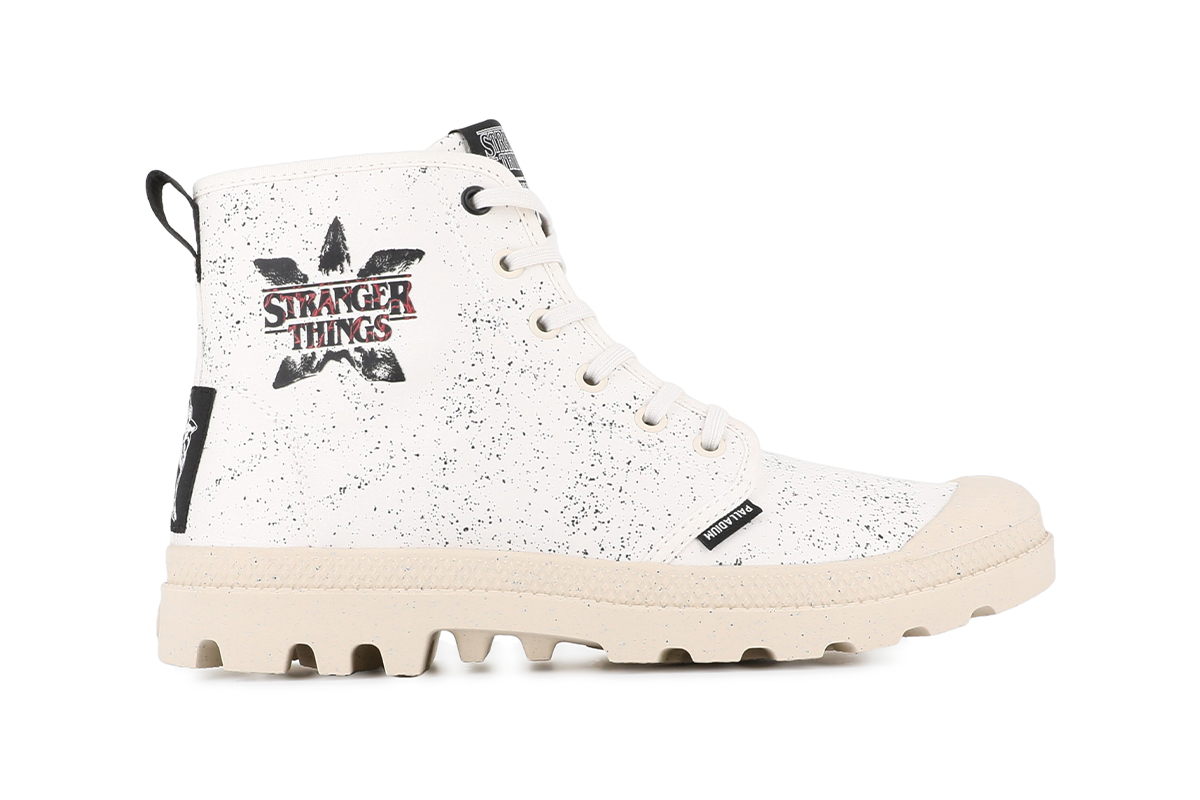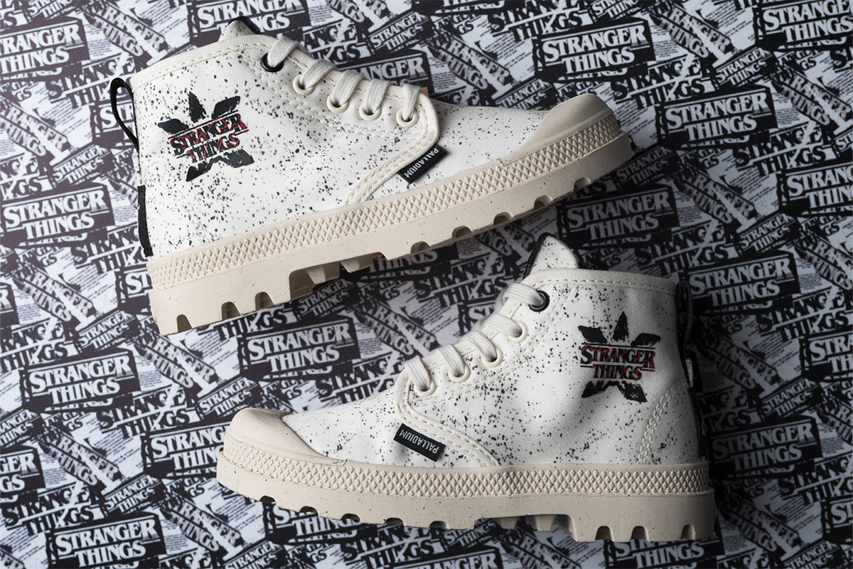 オフホワイトのキャンバス地に、デモドッグと『ストレンジャー・シングス』のシルエットを融合させた力強いロゴを配置。ヒールにはデモゴルゴンのシンボルを刻み込み、ライダーの足元を支える確かな存在感を放つ。内側には劇中の要素を織り込んだヴィンテージ新聞風ライニングをあしらい、履くたびに堅牢な造りと遊び心あるディテールを実感できる。さらにシュータンには逆さまに配したパラディウムロゴを採用し、タフな個性を際立たせている。