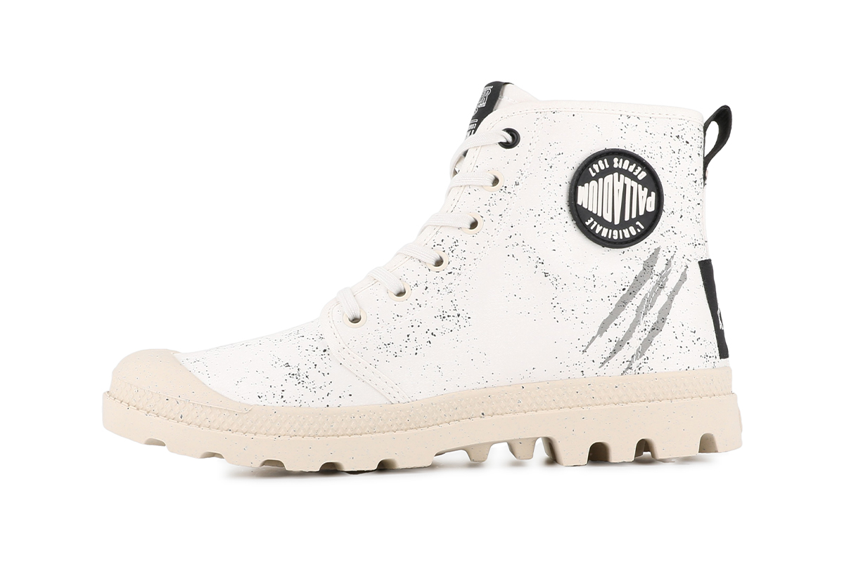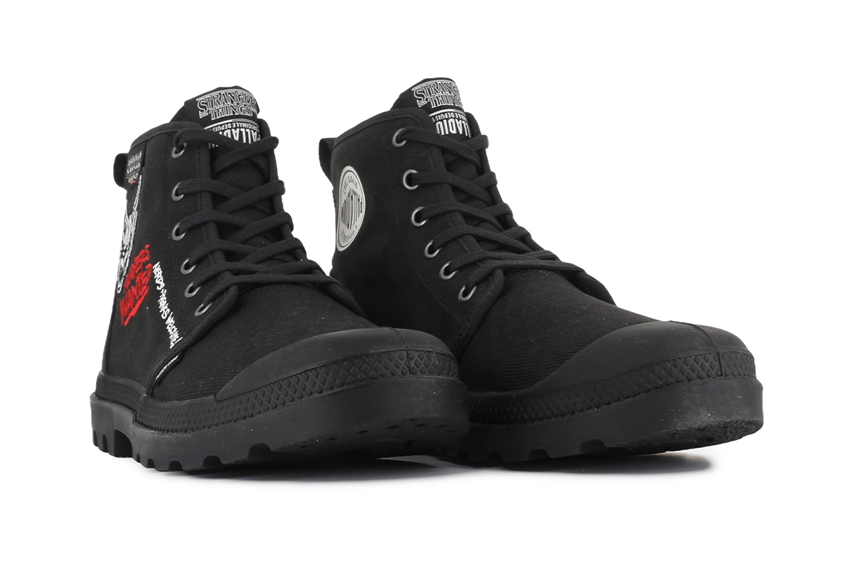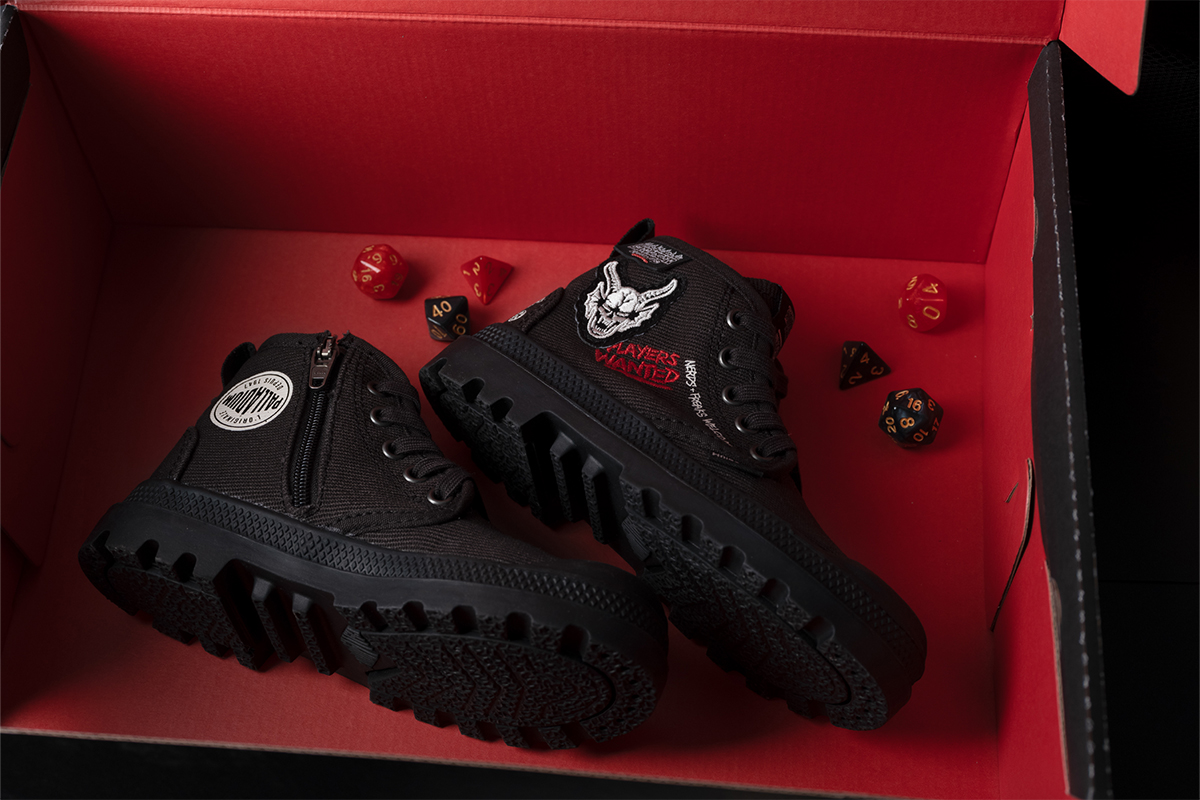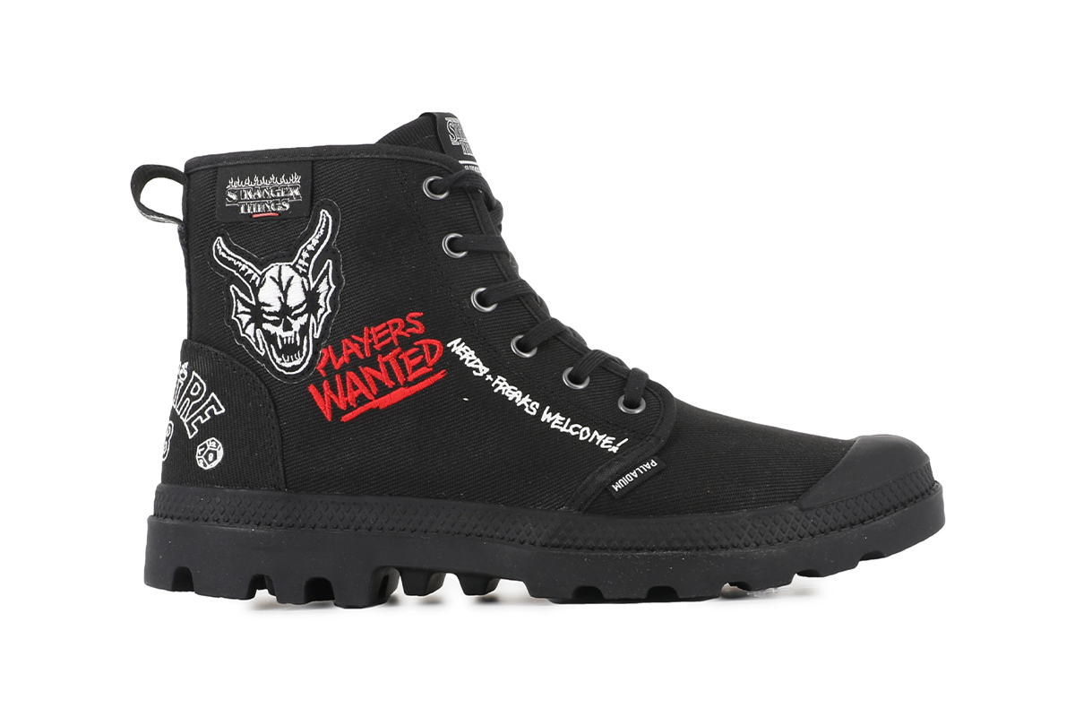 オフホワイトのキャンバス地に、デモドッグと『ストレンジャー・シングス』のシルエットを融合させた力強いロゴを配置。ヒールにはデモゴルゴンのシンボルを刻み込み、ライダーの足元を支える確かな存在感を放つ。内側には劇中の要素を織り込んだヴィンテージ新聞風ライニングをあしらい、履くたびに堅牢な造りと遊び心あるディテールを実感できる。さらにシュータンには逆さまに配したパラディウムロゴを採用し、タフな個性を際立たせている。