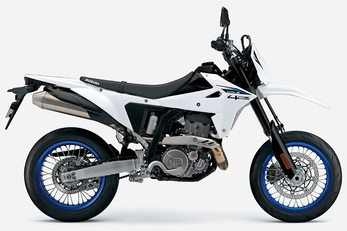 DR-Z4SMは、前後17インチのキャストホイール(タイヤはチューブレス)を採用し、日常使いからサーキット走行まで多彩なライディングを楽しめるスーパーモトモデルだ。