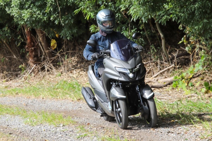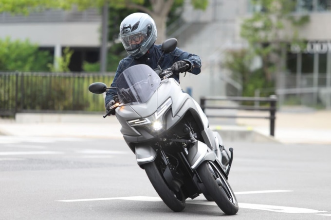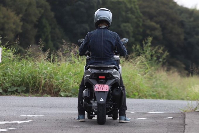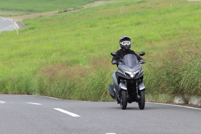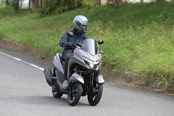 取りまわしではフロント二輪の重量を実感する場面もあった。車重は160 kg台とこれまで乗ってきた二輪と大きく変わらないが、フルロックで車体を押し引きするとフロントの重さで傾けすぎてしまいそうになる。ただ、切り返しを繰り返して小刻みに方向転換すれば問題なく扱えるし、ライダーが乗った状態でのUターンは片側一車線レベルの幅でも難なくこなせた。