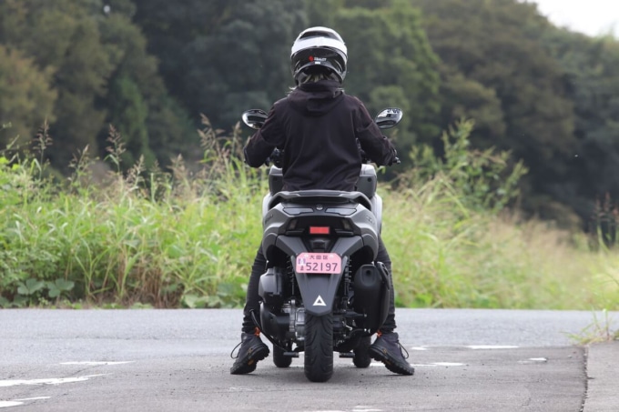 足着きは両足の母指球が接地し、シート幅はやや広いものの足を外側に開く感覚はそれほど気にならない。アクセルを開けずに足の力だけで動かそうとすると力が必要だが、エンジンを使えば取りまわしに不安はない。身長155cm/体重46㎏