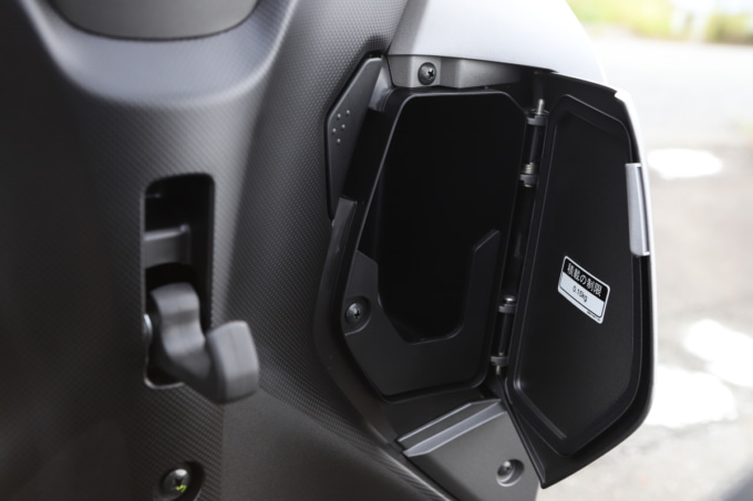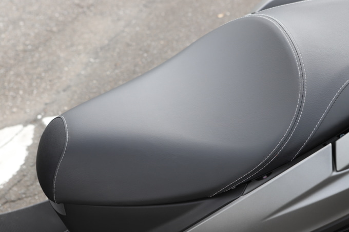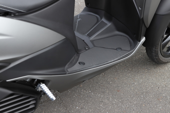 両足を降ろすとカカトまで接地するけれど、ヒザに余裕はない。車重があるのと重心位置、3輪ということで停車時の安定感は高い。乗車時はヒザを直角に曲げる姿勢で、足の置き場に自由度はほぼなし。シートが前後に長くポジションの自由度は高い。身長170cm/体重70kg