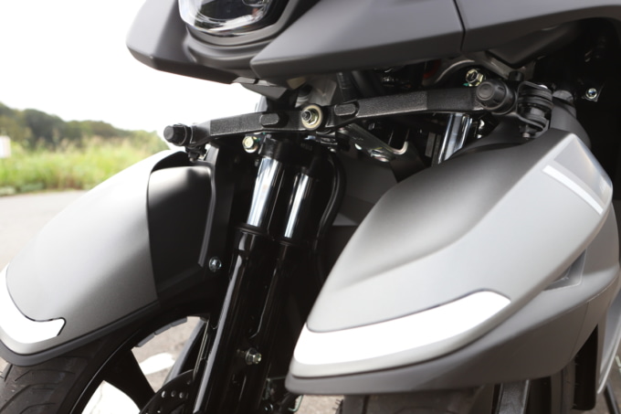フロントが2輪になり、それを支えるためのパーツが装着されているので二輪バイクに比べて圧倒的にフロントまわりが重い。重量にすると2輪の原付二種スクーターに比べて50㎏弱重い。ただし、実際に走らせてみると、それが原因で交通の流れに乗れないなんてことはなく、比較的流れの早い幹線道路でも問題はなし。さらに、多少起伏のある場所をタンデムで走ってみたけれど、こちらも不満はなかった。ブレーキもあらゆるシーンで、必要にして十分な効き具合だった。