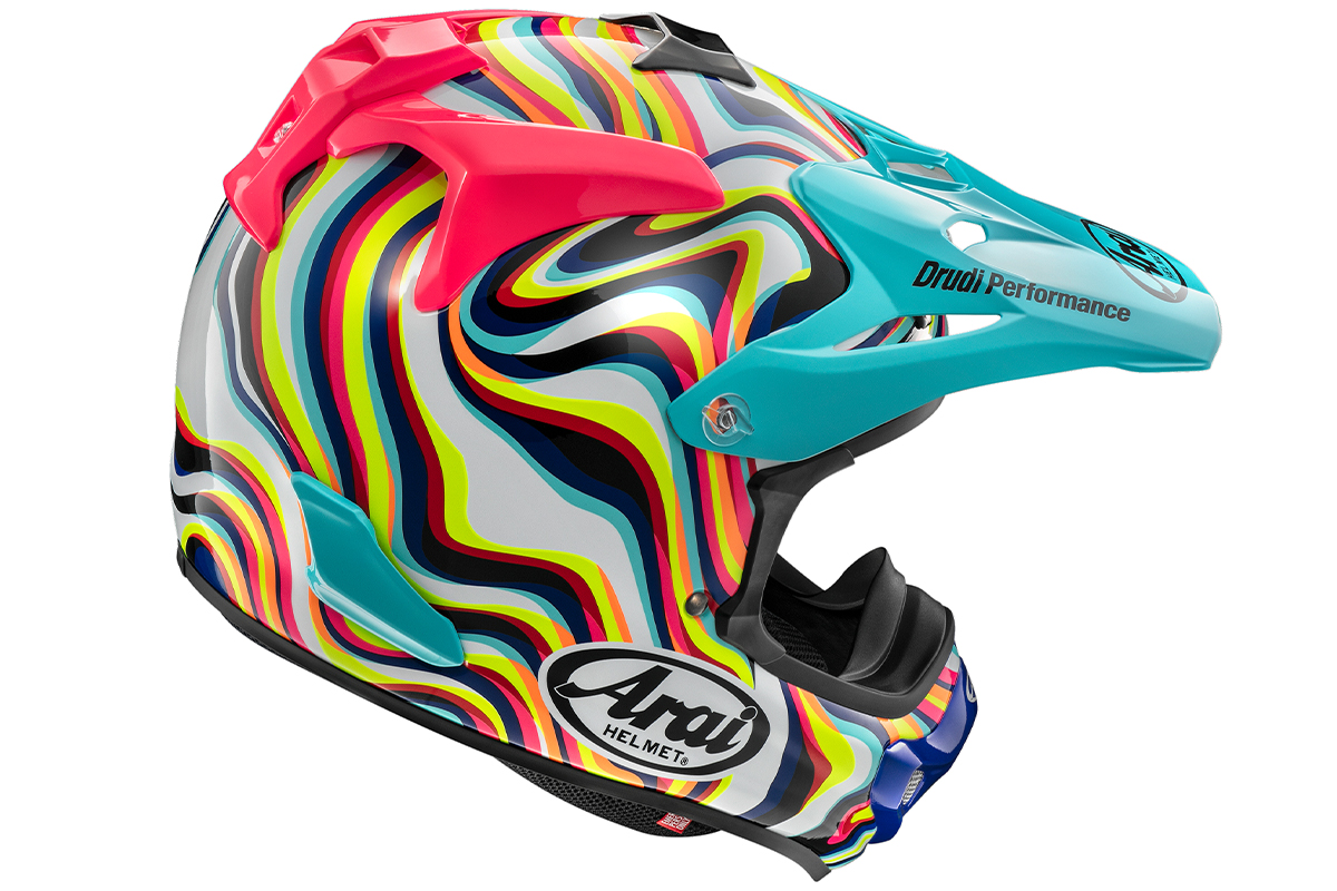 カラーバリエーションは、モトクロスコースのタイトなコーナーを軽快に駆け抜けるシーンをイメージしたピンクとブルーの2色。派手で力強いグラフィックが、走り出す前からオフロードの高揚感を掻き立てる。
