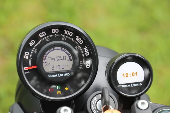 アナログの指針で速度が表示され、その中央部に燃料残量、走行距離、時刻、ギヤポジションなどが表示される液晶モニターが配される。右側はターンバイターンナビのモニターだ。