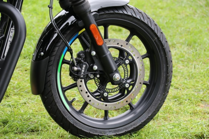 前後17インチのホイールは鋳造で、同じ350クラスのほかのシリーズよりスポーティな印象となる。ブレーキは前後とも定評のあるバイブレ製で効き具合をコントロールしやすい。