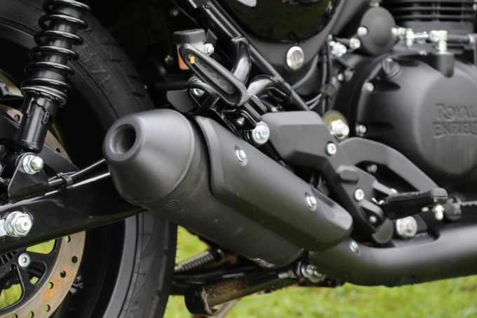 サイレンサーがカチ上がったマフラーは、ショートタイプということもありタンデムステップが低めに配されていて、タンデマーはヒザの曲りが抑えられて比較的タンデムしやすい。