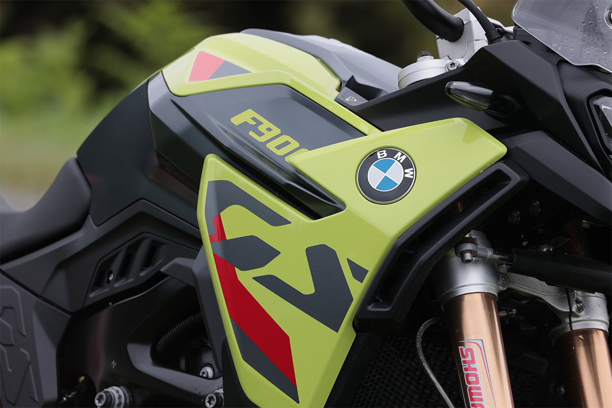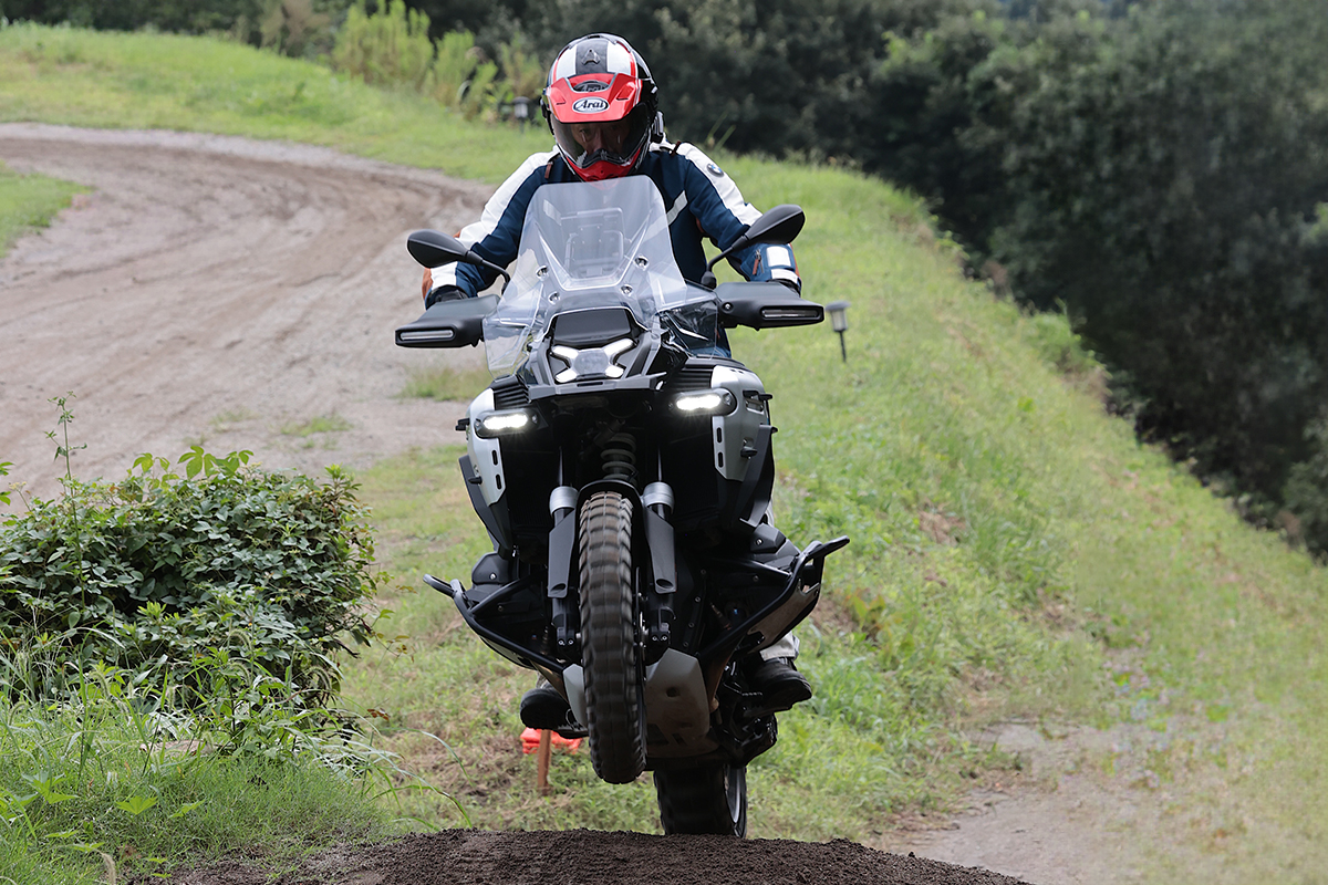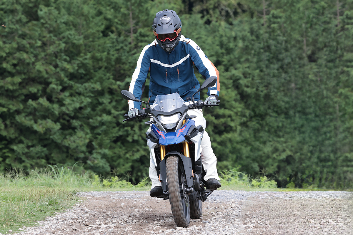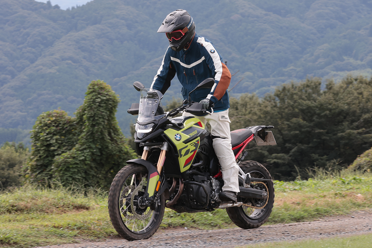 Rシリーズが水平対向エンジン+シャフトドライブという1923年にBMWが初めて販売した市販バイク『R32』から連綿と受け継がれるドライブトレーンを採用するのに対し、F900GSはより普遍的な並列2気筒、チェーンドライブを採用するGS。フロントに21インチ・リヤに18インチと走破性を重視したタイヤサイズを選び、前後に伸び側・圧側・スプリング初期荷重を調整できるフルアジャスタブルのサスペンションを装備。オフロード走破性を意識したパッケージが魅力。ゲレンデ/シュトラッセ、オフロードと舗装路を意味するドイツ語からGSと名付けたモデルだけに舗装路の快適性や走りも納得。今回のようなコースでも楽しくなるほどパワフル。足つき性さえクリアすればビッグオフ好きにはたまらないモデルだ。