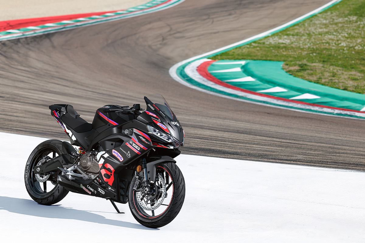 アプリリアの人気スポーツバイクRS457の特別仕様モデル『RS457GP Replica』も発表された。ビギナーに優しい扱いやすさを持ちながら、上級者が走ればしっかり速い。そんな“懐の深さ”が魅力のモデルである。
