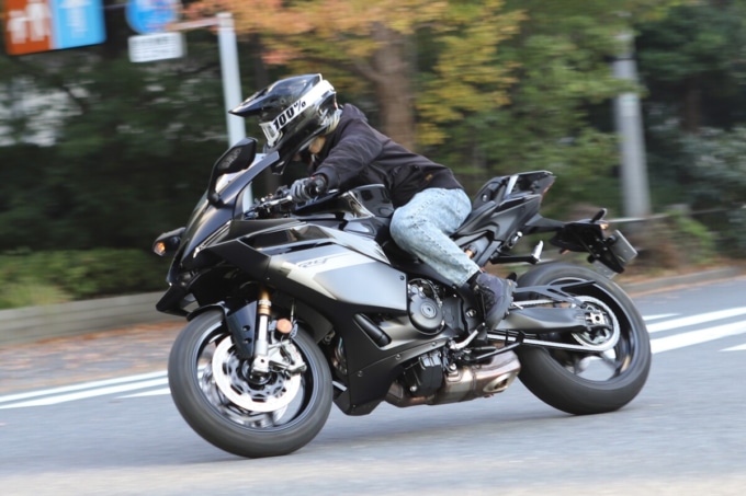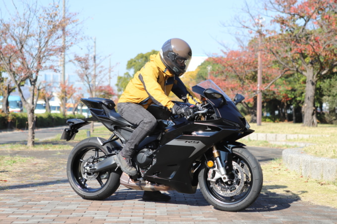 スーパースポーツ特有の前傾姿勢に身構えていたが、実際は上体が前に倒れすぎずハンドルまでの距離も遠くない。YZF‑R6よりハンドルが高く近く、フットペグも低めに設定されているため 、攻めた姿勢ながら必要以上に窮屈ではなく、腕が伸び切る感じもなかった 。クラッチレバーには調整機能があり、初期設定では手の小さな自分には遠く感じたが、調整後はちょうどよい位置になり操作しやすくなった。シート高830mmは片足を下ろして母指球が接地する程度。R1やR6より足つきが良く、R7と同じくらいの足つきだ。車体重量も数値ほど重く感じず、初めて大型バイクに乗るとき特有の緊張感が薄れた。半クラッチでの低速走行も安定しているため、取り回しやUターンで心に余裕を持てた。