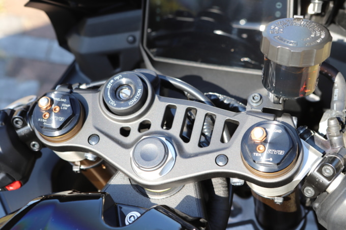 両足を下ろすとカカトまでベタ着きとなる。そしてポジションが意外とラク。またぐ際はタンデムシート位置が高いので気をつかうけれど、またがってしまえばスーパースポーツにしては前傾しないポジションに拍子抜けする人は多いかも。乗車中に体を動かしやすいのもいい。身長170cm/体重70kg