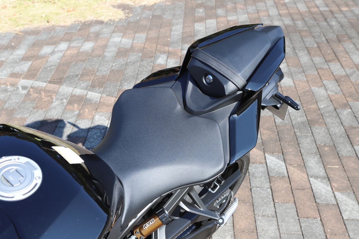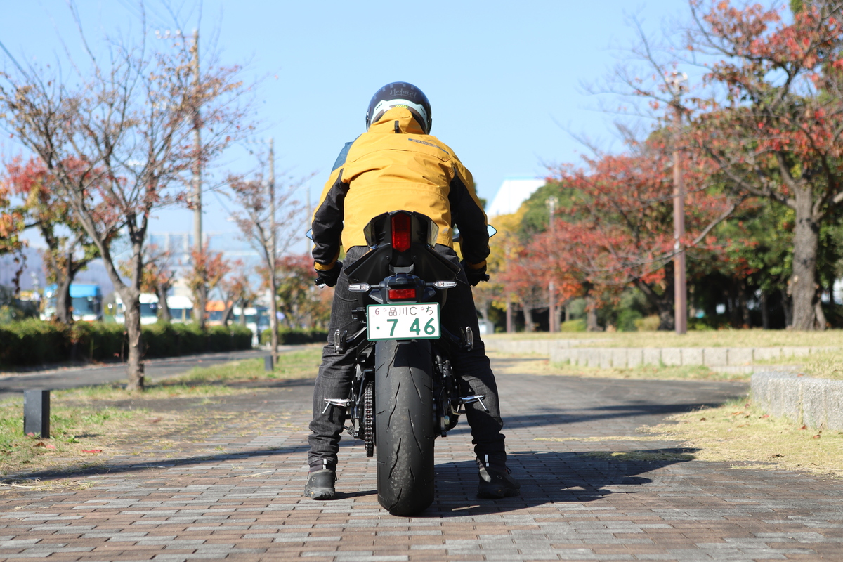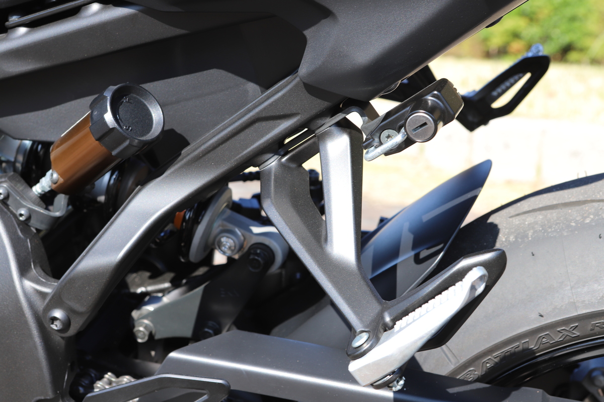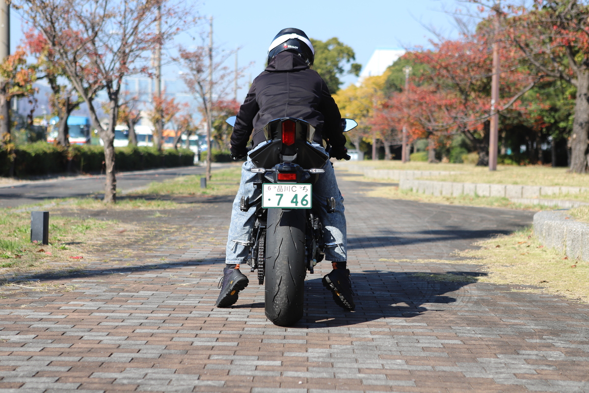 両足を下ろすとカカトまでベタ着きとなる。そしてポジションが意外とラク。またぐ際はタンデムシート位置が高いので気をつかうけれど、またがってしまえばスーパースポーツにしては前傾しないポジションに拍子抜けする人は多いかも。乗車中に体を動かしやすいのもいい。身長170cm/体重70kg