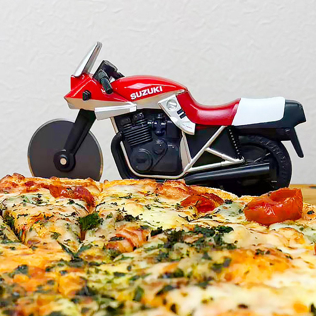 ピザカッターナは、前輪ブレードでピザをスパッと切り裂くという、乗り手の胸を熱くするギミックが魅力。カット後は専用ホルダーにセットすれば、まるで『ガレージにたたずむKATANA』のように飾ることができ、キッチンまわりの空気が一変する。