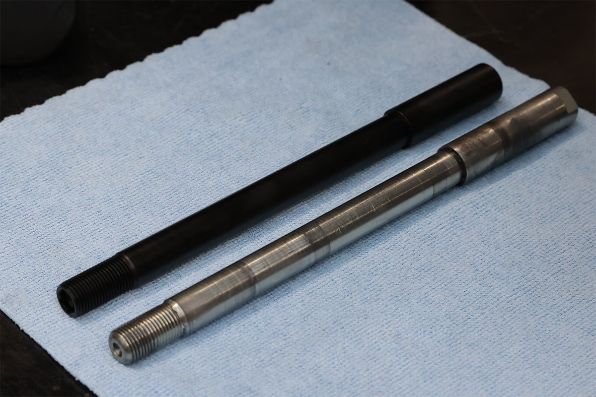 なお、厳密に言うとアクスルシャフトはホイールにダイレクトに接しているわけではない。ホイールに組み込まれベアリングを介して支持している。このベアリングは高い精度で作られている部品だ。アクスルシャフトの精度が出ていなければ、このベアリングがスムーズに動かない。そのためZERO POINT SHAFTは直径にもこだわって作り込まれている。そのためベアリング本来の動きを導き出せ、それがプラスの効果として感じられるわけだ。下の写真はフロントアクスルシャフトで、上がZERO POINT SHAFT、下が純正アクスルシャフトになる。純正にはベアリングと接している部分に跡が残っているのがわかるだろう。