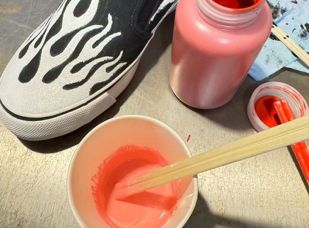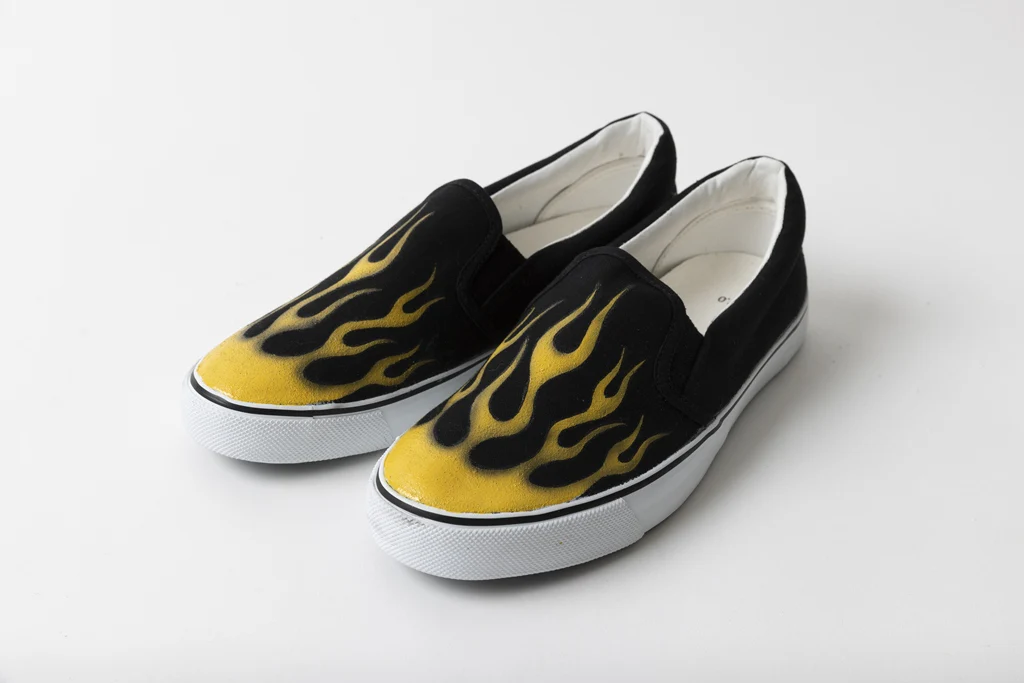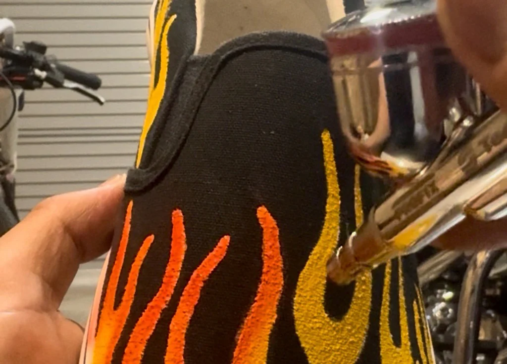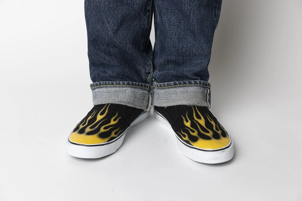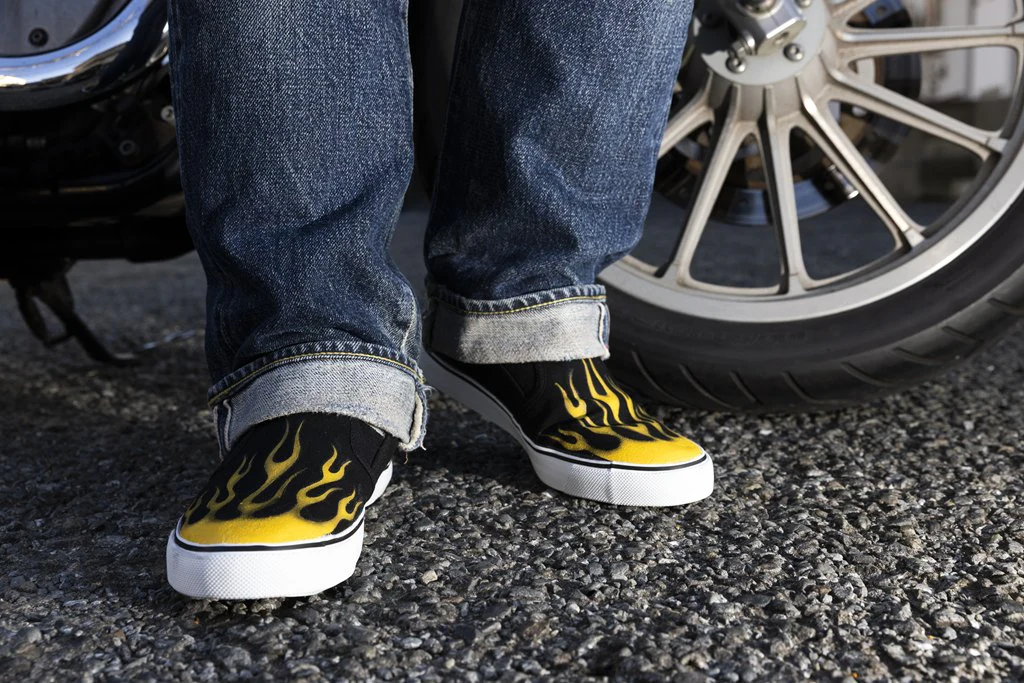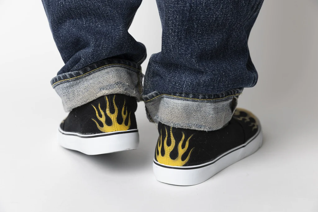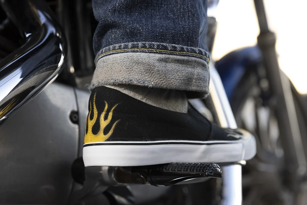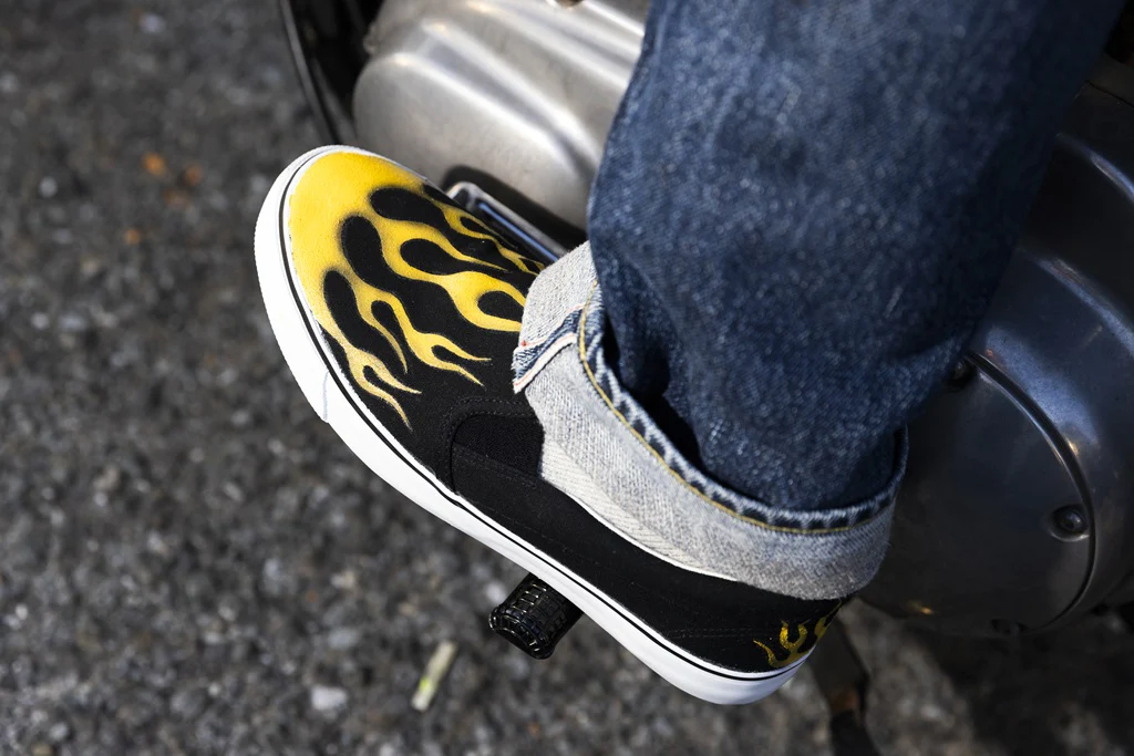 ベースに採用したのは、近年ライダーを中心に支持を広げている a.c.m.shop の『フレイムスシューズ』。サイドとヒール部分にはオリジナルパターンを施し、象徴的なフレイムモチーフの力強さを残しながらも、全体はすっきりとしたバランスにまとめている。