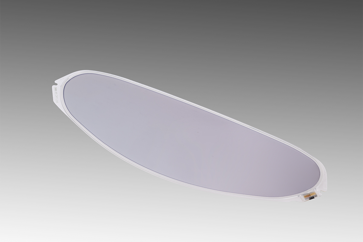 一方『e:DRYLENS』なら暗所での見にくさや、シールドの付けかをする心配はない。調光モードは2種類を選択可能。一つ目は周囲の光をセンサーが読み取り、自動で最適な明るさに変化させるモード。二つ目は手動で明るい状態と暗い状態を切り替えるモードで、専用のコントローラーによって操作が可能になっている。ちなみに明るいライトモードの光線透過率は65%のライトスモークで、暗くすると透過率20%のダークスモークへと瞬時に変化する。
