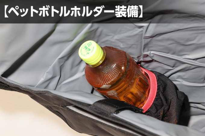 メイン気室内にはペットボトルホルダーを標準装備。バッグの中で転がることなく、必要なときにスムーズに取り出せる。とくに夏場のツーリングではありがたい装備だ。