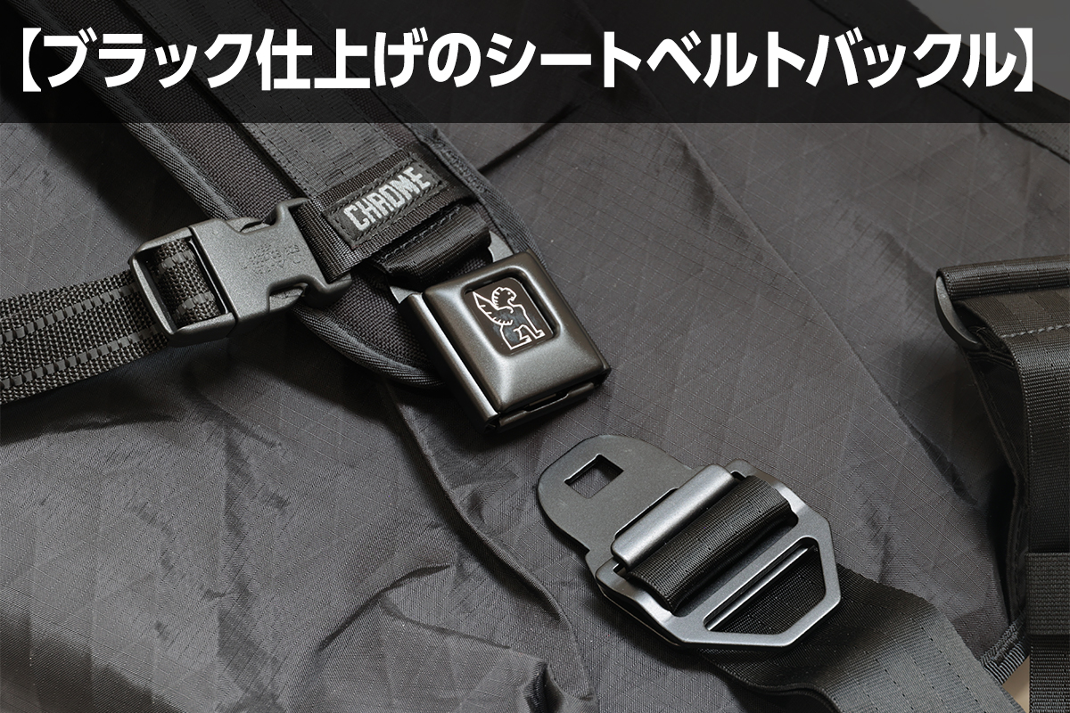 CHROMEの象徴ともいえるシートベルトバックルは、あえてブラックで統一。無骨さを抑え、全体の印象を引き締めている。機能性とデザイン性、そのどちらも犠牲にしない姿勢が感じられるディテールだ。