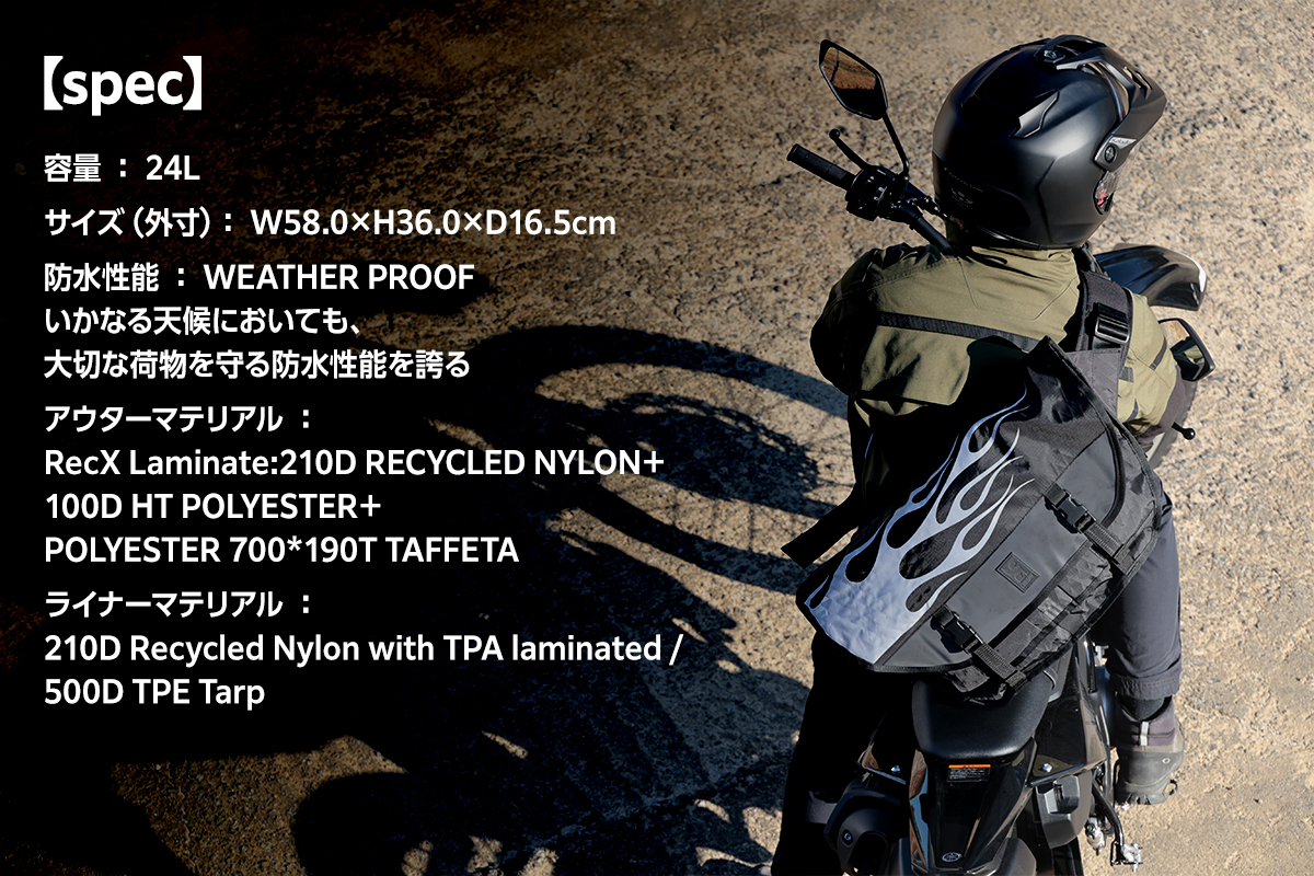 さらにアウター素材には、軽量かつ高耐久・高耐水性を誇る「RecX」を採用。突然の雨でも荷物をしっかり守り、天候に左右されないライディングを支える。