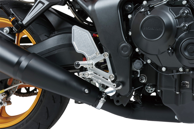 CB1000Fのネオレトテイストをさらに引き立てる2D加工で、シンプルかつ洗練されたスタイリングが特徴。ブレーキ/チェンジペダルは純正に近いレシオを採用し、高い剛性とすぐれた操作性を両立。さらに純正クイックシフターも同時装着が可能になっている。上で紹介しているコンバーチブルステムキットとセパレートハンドル&トップブリッジキットとのマッチングも良好だ。ブラックとシルバーを選択でき、アルミ製(アルマイト仕上げ)、純正ブレーキホース使用可、4ポジション(①バック30㎜/アップ34㎜②バック30㎜/アップ45㎜③バック41㎜/アップ34㎜④バック41㎜/アップ45㎜)、逆チェンジ不可となる。