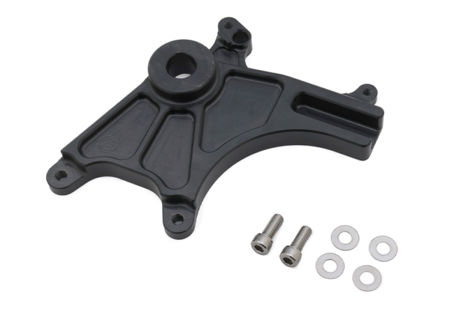 ゲイルスピードまたはブレンボ製2ポットキャリパ ー(84㎜)を装着するためのキャリパーサポート。軽量・小型のキャリパー装着でコントロール性の向上をねらえる。キャリパー装着位置が純正のスイングアームの上から、スイングアーム下になり、純正サイズのディスクローター(φ24㎜)に対応。ただし装着にあたってブレーキホースの交換が必要になる。