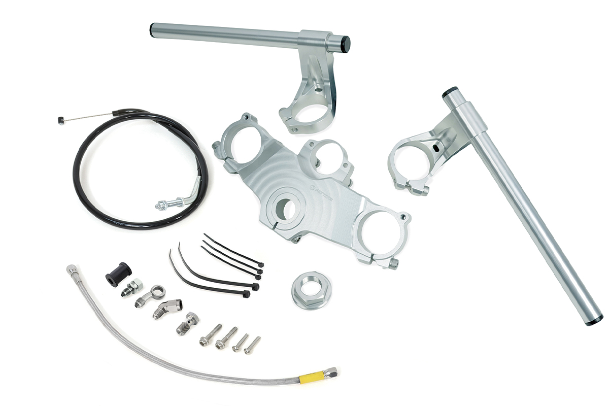 ストリートランとスポーツランに最適な剛性と車体バランスを追求。70〜80年代の純正クリップオンハンドルをオマージュし、シャープなデザインと快適なポジションを両立している。最小絞り角度 128〜132度・垂れ角0度。ハンドルエンド幅:743㎜・ハンドルロック可能だが、採用した場合は構造変更が必要になる。また偏芯カラーを採用しいることもポイント。180度入れ替えることでフォークオフセット量が変化させることが可能(32.5㎜/35㎜)。ショートオフセットではクイックでスポーティーなハンドリングになるぞ! また、オフセット量を可変できないタイプの『セパレートハンドル&トップブリッジキット』も用意されている。どちらもシルバーとブラックから選択可能だ。
