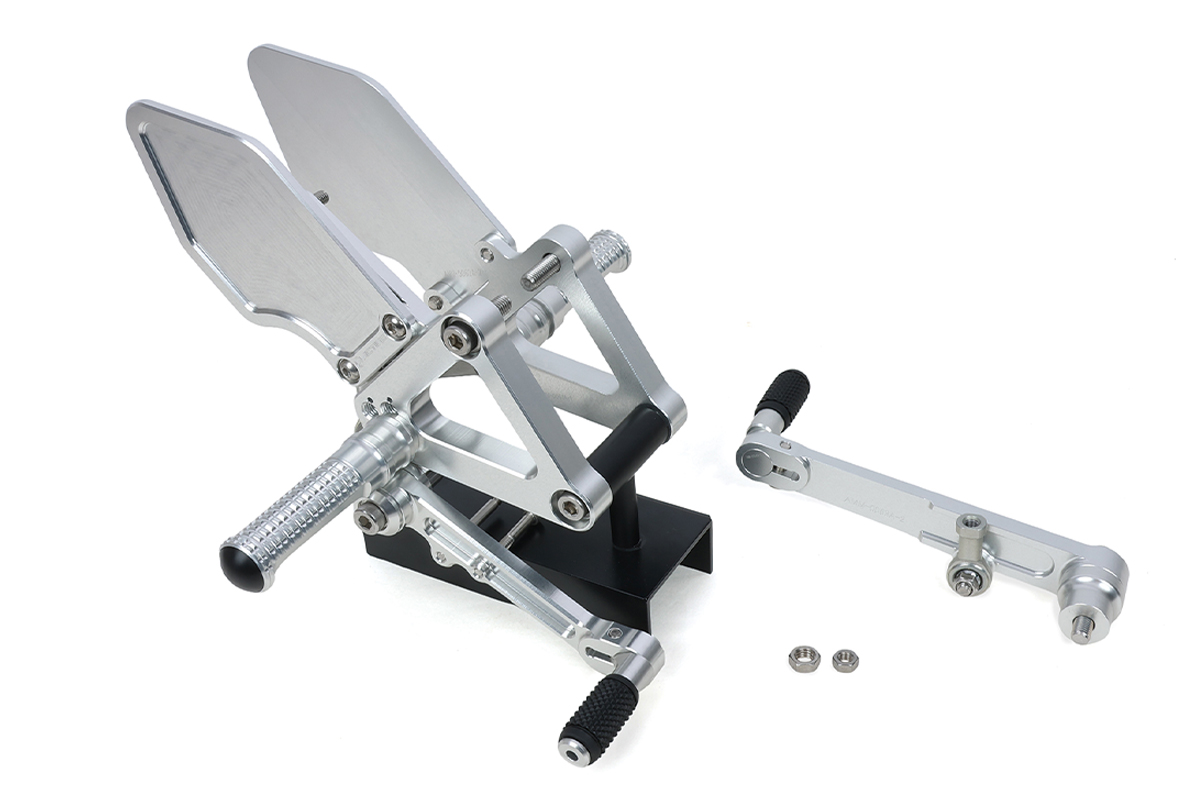 CB1000Fのネオレトテイストをさらに引き立てる2D加工で、シンプルかつ洗練されたスタイリングが特徴。ブレーキ/チェンジペダルは純正に近いレシオを採用し、高い剛性とすぐれた操作性を両立。さらに純正クイックシフターも同時装着が可能になっている。上で紹介しているコンバーチブルステムキットとセパレートハンドル&トップブリッジキットとのマッチングも良好だ。ブラックとシルバーを選択でき、アルミ製(アルマイト仕上げ)、純正ブレーキホース使用可、4ポジション(①バック30㎜/アップ34㎜②バック30㎜/アップ45㎜③バック41㎜/アップ34㎜④バック41㎜/アップ45㎜)、逆チェンジ不可となる。