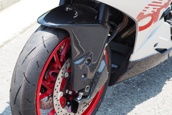 倒立フロントフォークのインナーチューブをカバーする形状になっているのが特徴。「FRP・黒」「平織りカーボン」「綾織りカーボン」から選択できる。