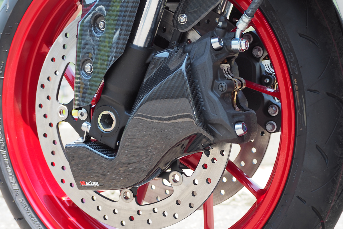 走行風を効率よくブレーキキャリパーに送り込むことで冷却をうながし、安定した性能発揮が期待できるパーツだ。レーシーな雰囲気も高めてくれる。「FRP・黒」「平織りカーボン」「綾織りカーボン」が用意されている。