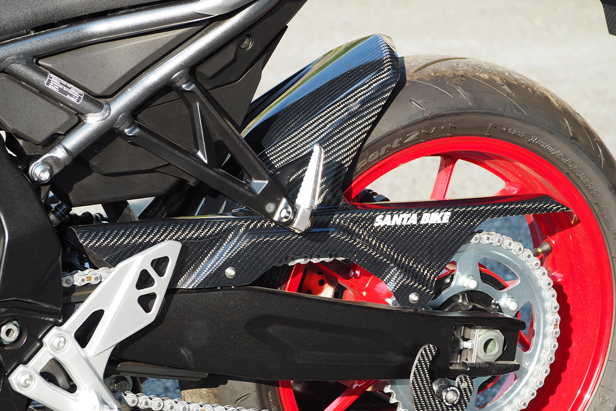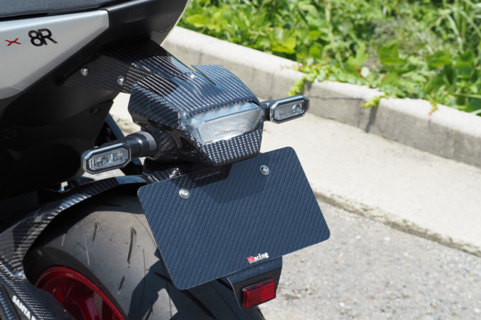 テールまわりにシャープな印象を植え付けるフェンダーレスキット。純正ウインカー・純正テールランプ・純正ナンバープレート灯を使用するが、リフレクターは別途用意する必要がある。「平織りカーボン」「綾織りカーボン」の二つが用意されている。